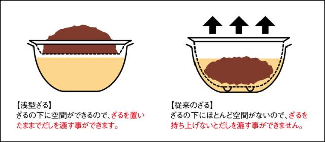 ボウルの上にのせてだしをとる時に用います。ボウルにしっかりはまる盆ざるのように使えます。ざるがぐらつかず安定し、だしの材料がだしに浸かってしまう事が無いので最後の一滴までしっかりと良い状態で漉す事ができます。晒しの布巾を敷いて使うと、より透明度の高い上質なだしを家庭でとる事ができます。