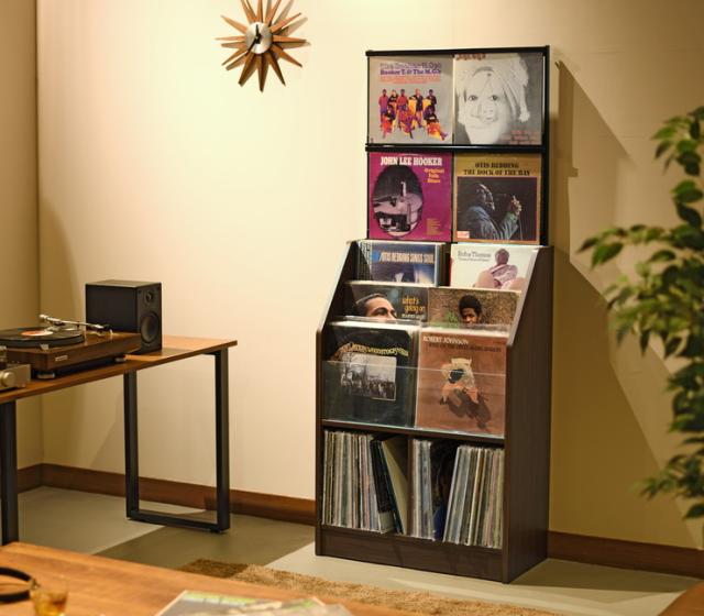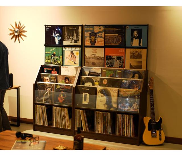 アナログレコードのコレクションをレコード店の様にディスプレイしながら収納できます。