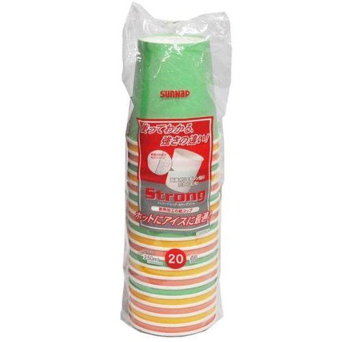 「サンナップストロングカップカラーアソート250ml20個入C2520SCA」は、持ちやすく丈夫な断熱タイプの3色カラーアソート紙コップです。断熱加工の紙コップです。熱い飲み物も持った手に熱さが伝わりにくく、冷たい飲み物も結露ができにくく、コップが柔らかくならない優れもの。温かいお飲み物、冷たいお飲み物兼用。両面ポリエチレン貼なので丈夫で便利な使用感です。○商品サイズ:口径80×高さ83.9mm○容量250ml○20個入。○3色入り(グリーン・イエロー・ピンク)で20個入。