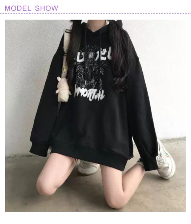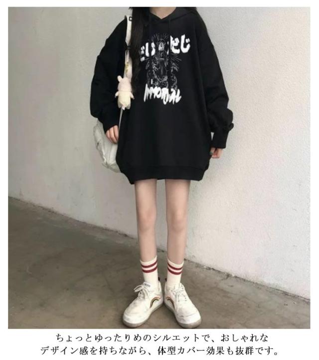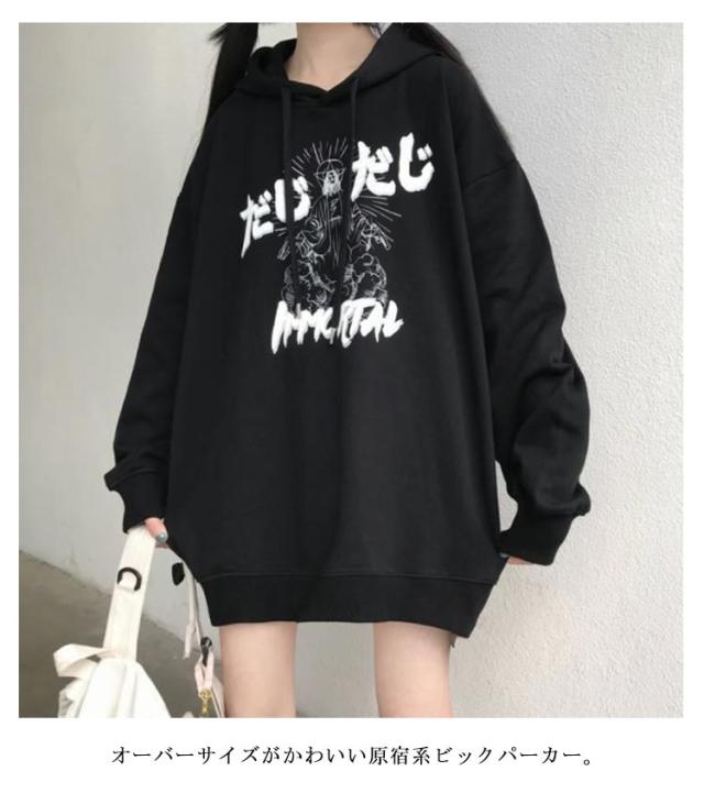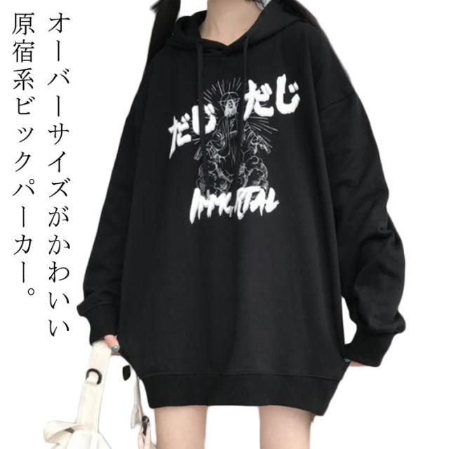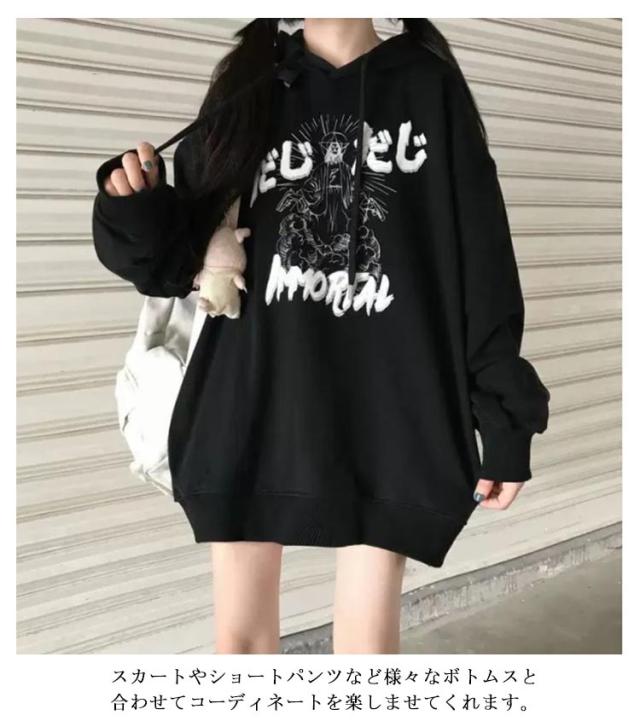パーカ プルオーバー 黒 トレーナ レディース ゆったり 長袖 トップス 学生 春 秋 通学 地雷系 量産型 服 パンク 病みかわいい アニメ プリント サブカル系 原宿系 ストリート フード付きパーカー スウェット 暗黒系 個性的 ゴスロリ