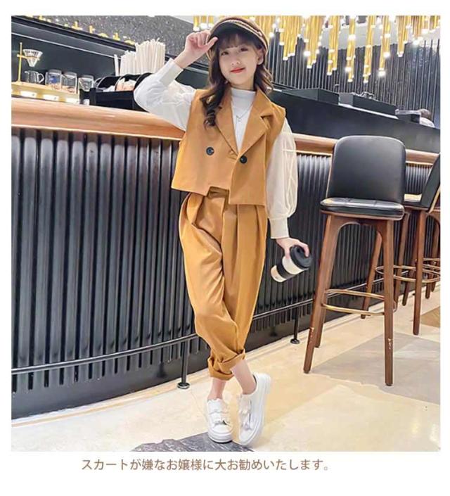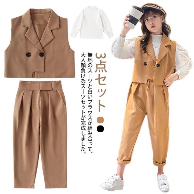 卒業式 入学式 スーツ 女の子 パンツスーツ 大きいサイズ ゆったりサイズ 150 160 165 170 小学生 ジュニア 子供服 春秋 セットアップ フォーマル スーツ ブラウス 白シャツ ベスト パンツ おしゃれ 発表会 結婚式 ブラック 黒 110 120 130 140 150 160 170
