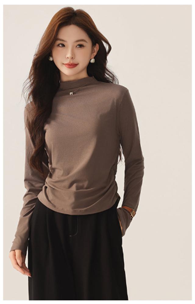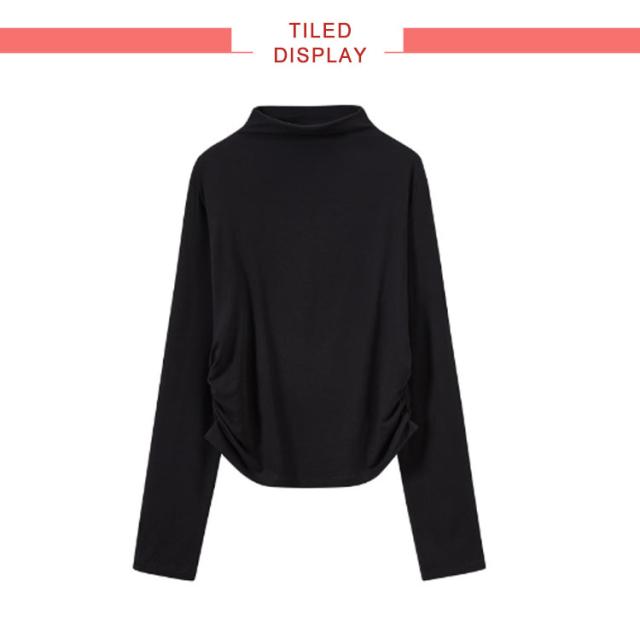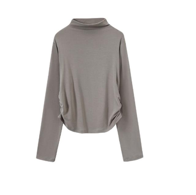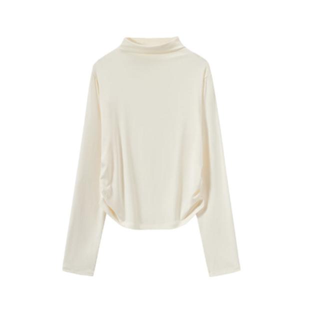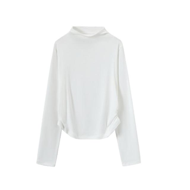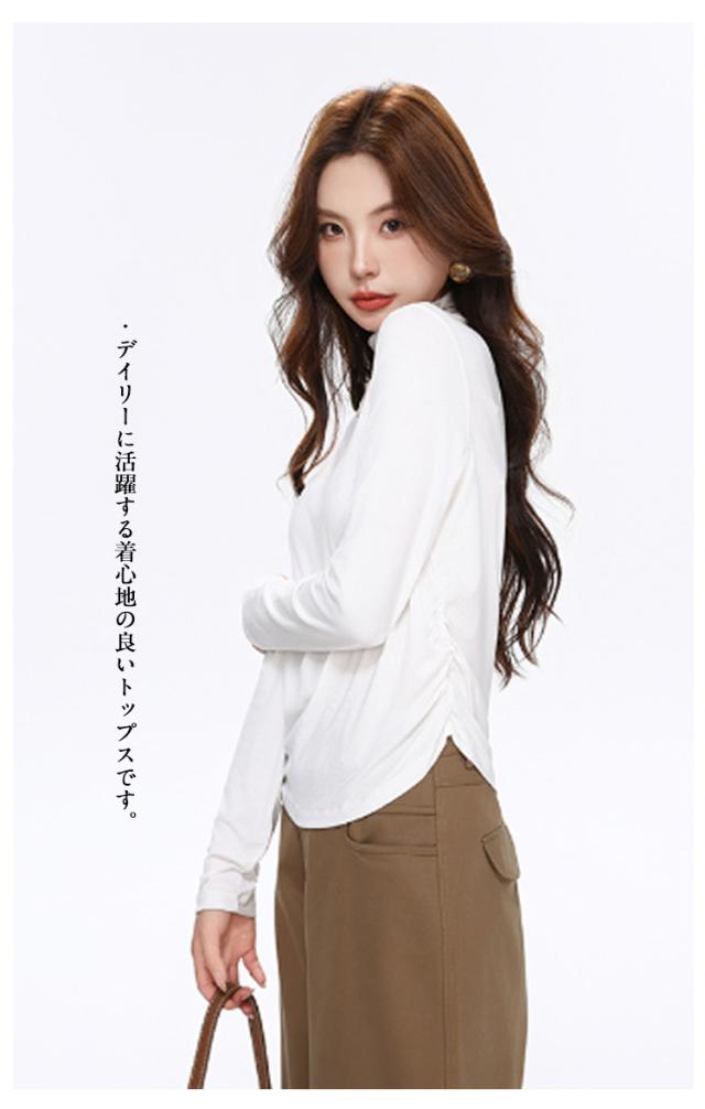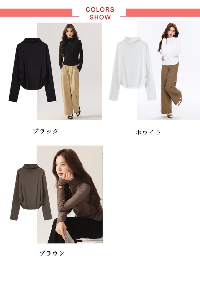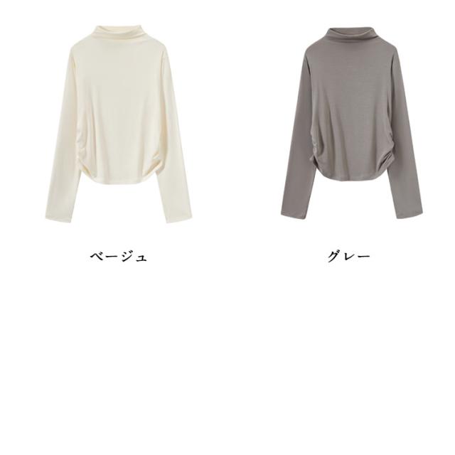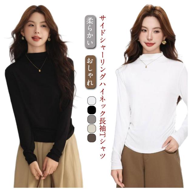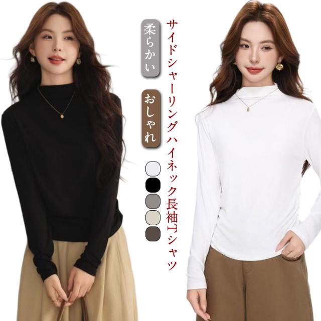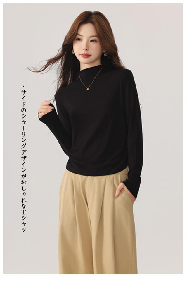Tシャツ サイドシャーリング ハイネック カットソー レディース トップス プルオーバー ウエスト 絞った 薄手 インナー シンプル 大人カジュアル 重ね着 滑らか肌ざわり 柔らかい きれいめ おしゃれ フリーサイズ