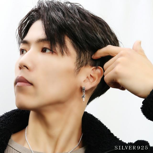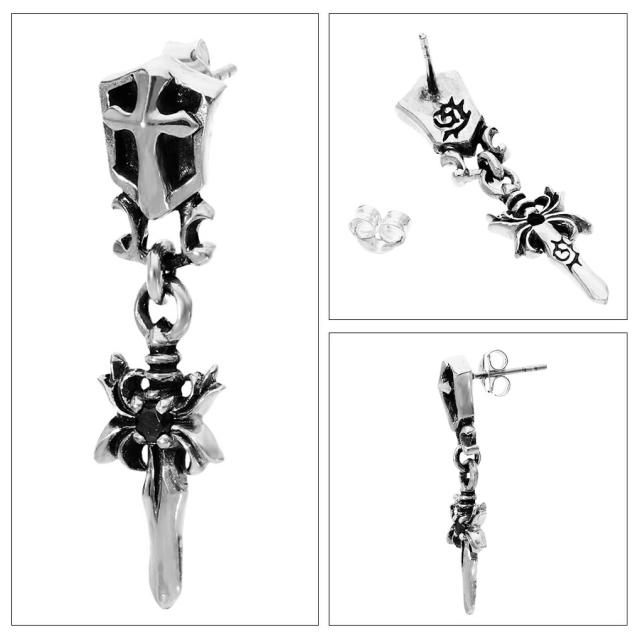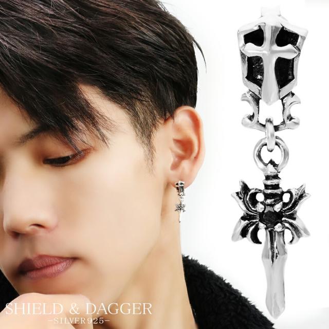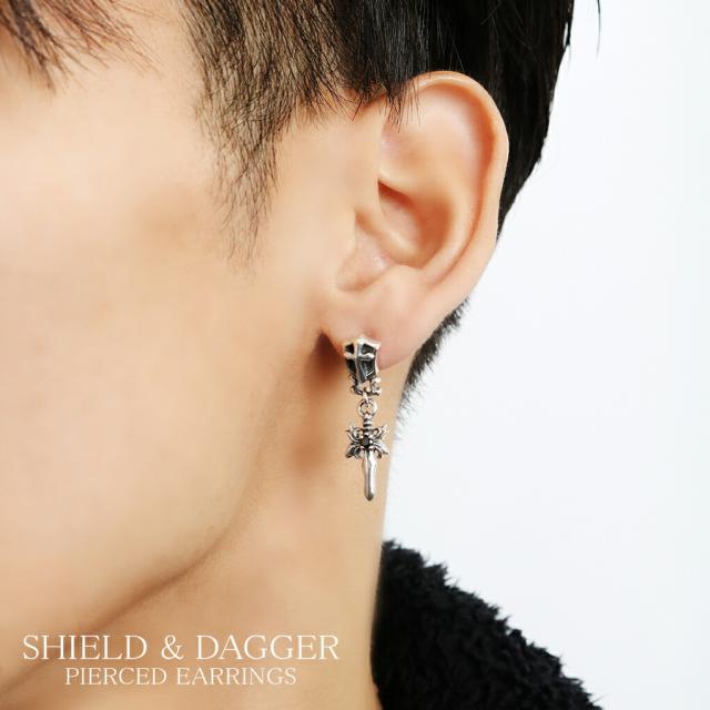 ダガー シールド ブラックジルコニア ドロップ シルバー ピアス 1P 片耳用 メンズピアス 短剣 武器 刃物 盾 クロス 十字架 ブラック ジルコニア