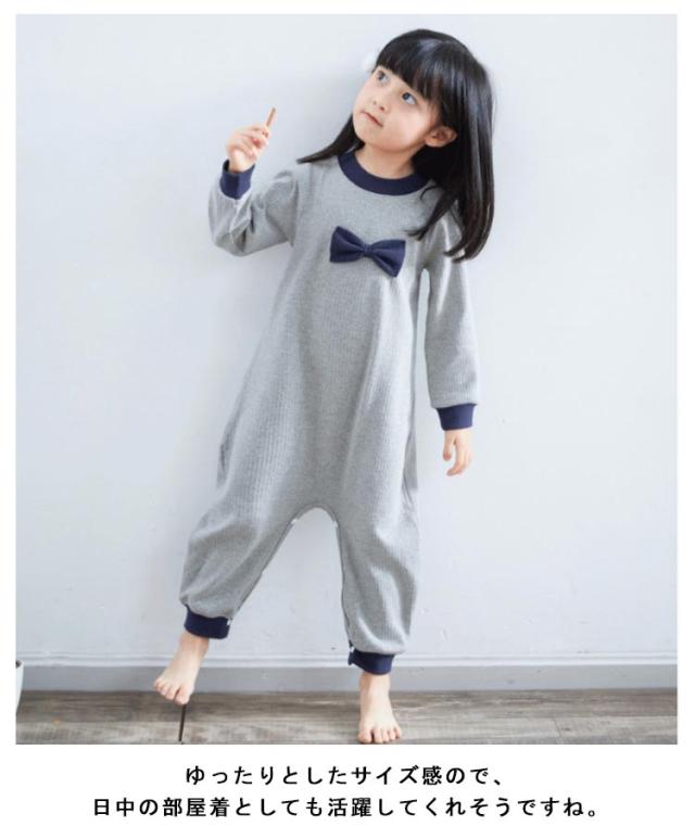 | 90-160cm!お腹が冷えず着せやすいつなぎタイプの子供パジャマ。 肌触り優しい綿生地で、通気性・吸汗性も抜群、大切なお子様により快適な快眠を◎ 胸もとにリボンが可愛らしさUP! 裾にある”スナップボタン”がこのパジャマのポイント。 股下はスナップボタンで全開できるから、おむつ替えもラクラク! ゆったりとしたサイズ感ので、日中の部屋着としても活躍してくれそうですね。 | |
