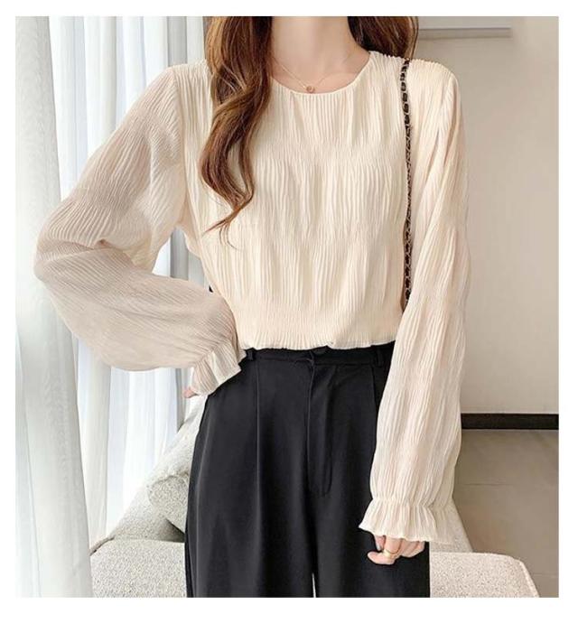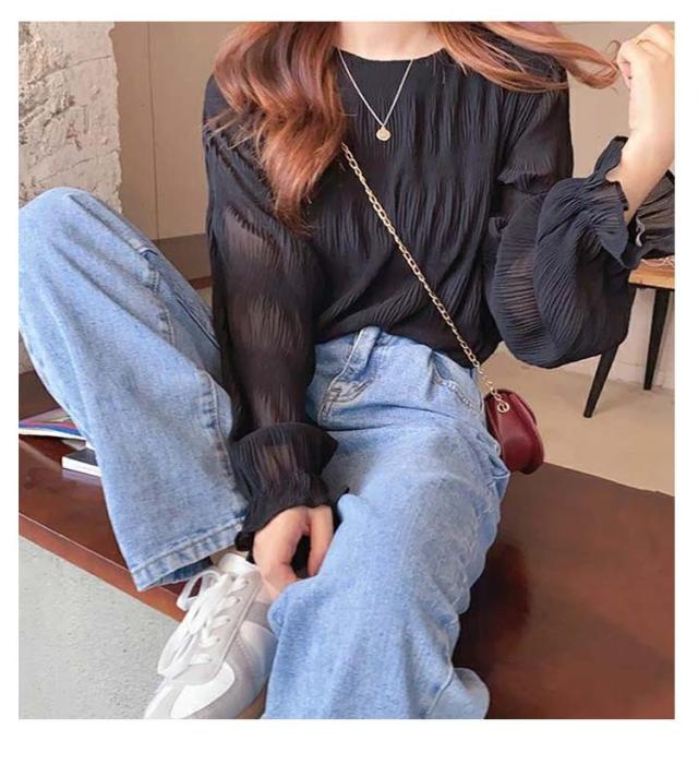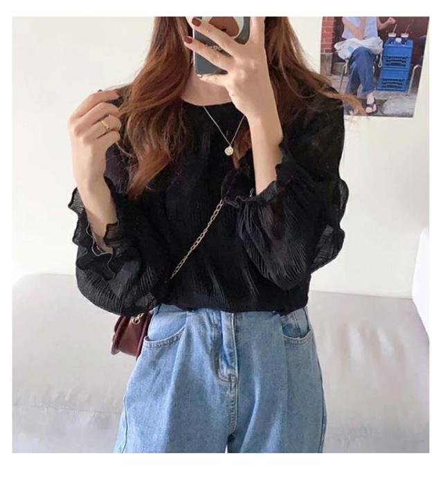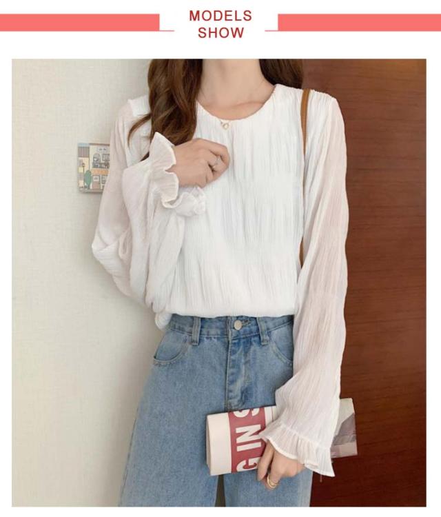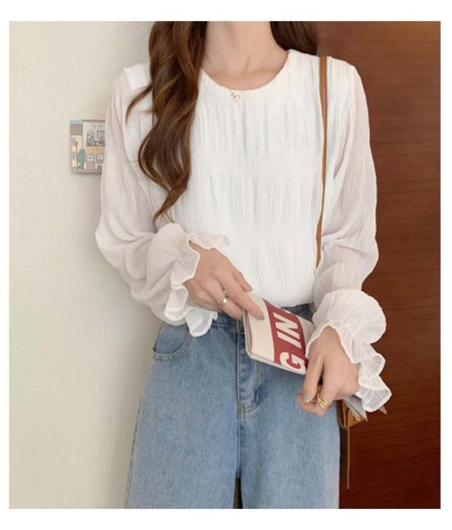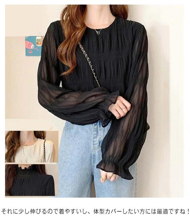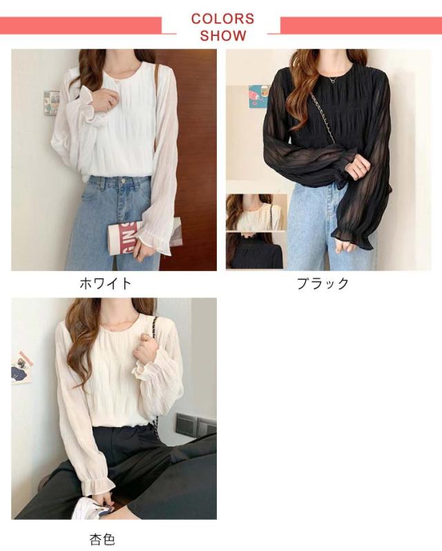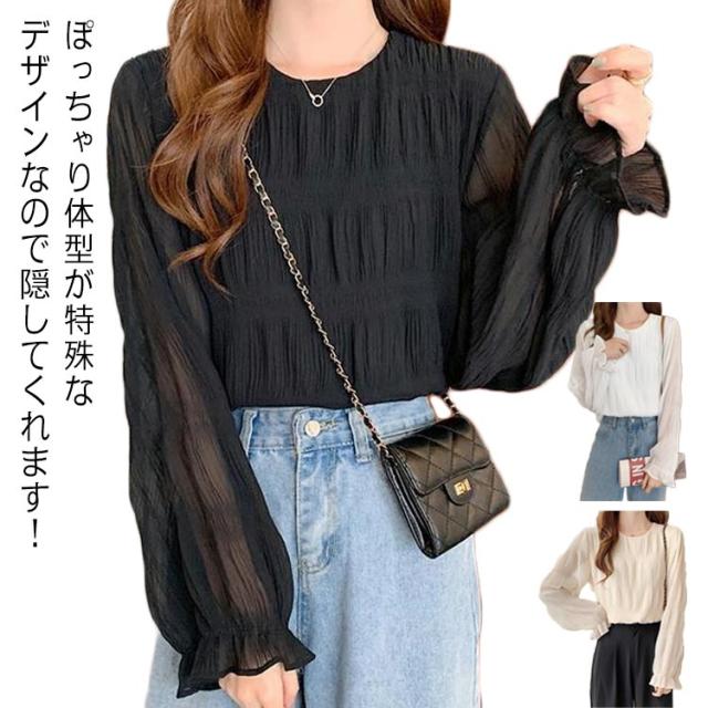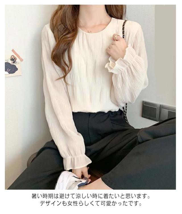 送料無料 ブラウス レディース 長袖 シフォンブラウス フリルスリーブ クルーネック フリーサイズ 高伸縮 裏地付き 可愛い 着痩せ 通勤 春 夏 秋 M-XL