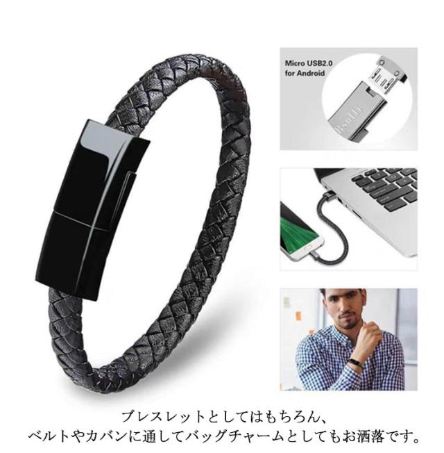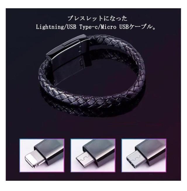 | 2本セット 携帯にとても便利なブレスレット型充電ケーブル ブレスレットになったLightning/USB Type-c/Micro USBケーブル。 ブレスレットとしてはもちろん、ベルトやカバンに通してバッグチャームとしてもお洒落です。 必要な時にはさっと充電ケーブルになります! 身に着けて持ち運べるため紛失や置き忘れ防止に! | |