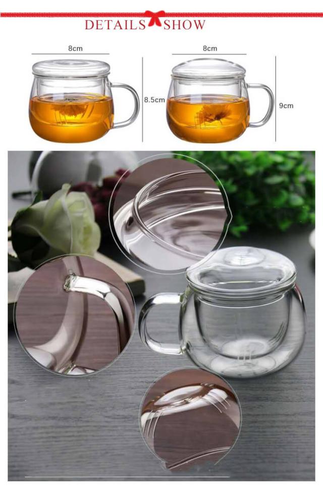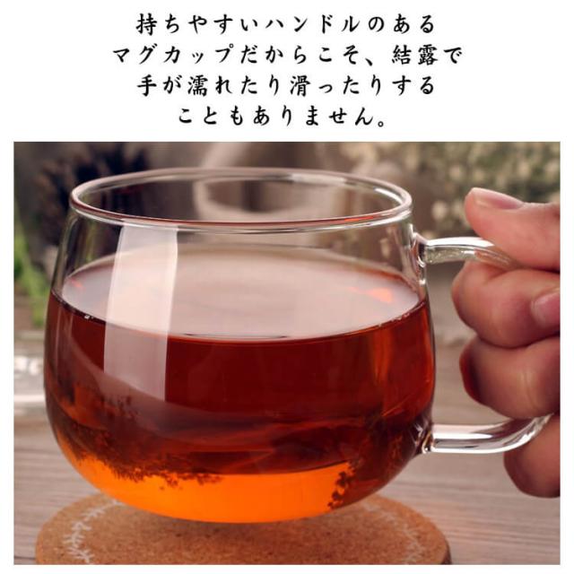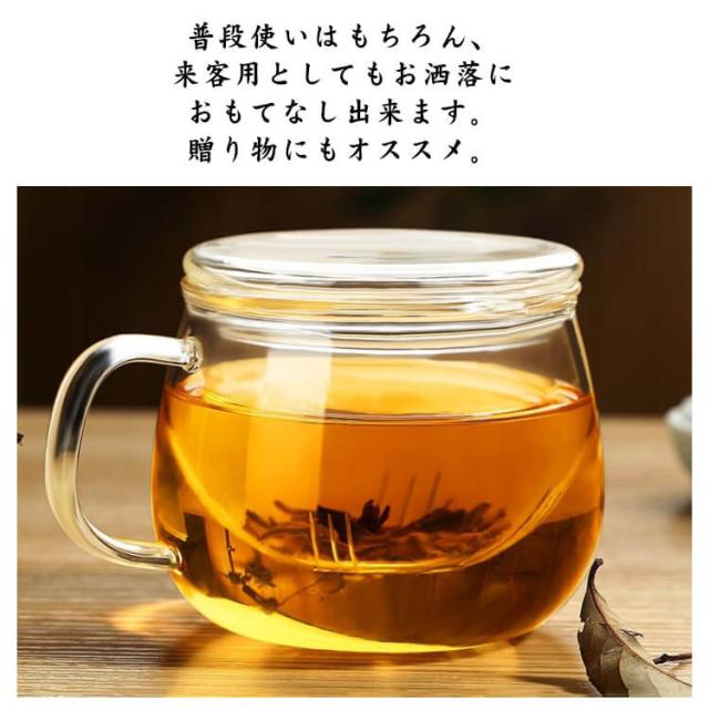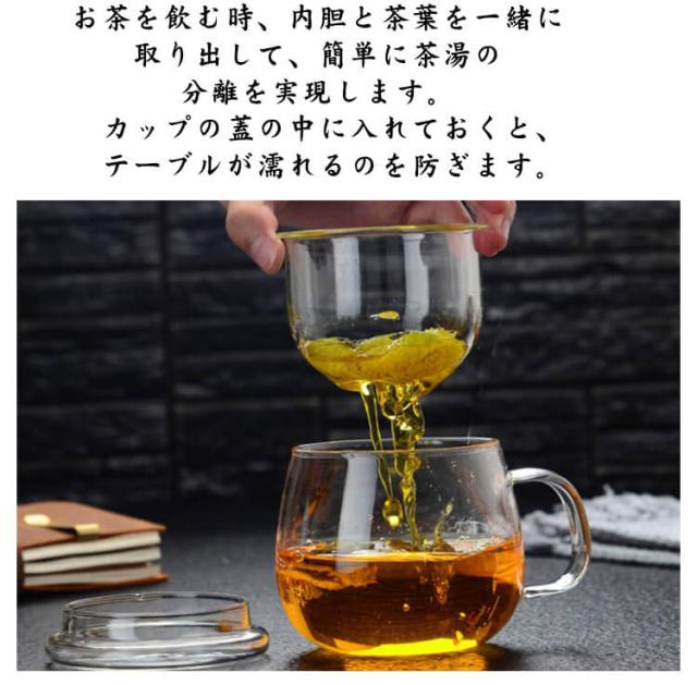 | 厚く耐熱ガラス製のマグカップ。 お茶を飲む時、内胆と茶葉を一緒に取り出して、簡単に茶湯の分離を実現します。カップの蓋の中に入れておくと、テーブルが濡れるのを防ぎます。 厚手の耐熱ガラスで−20°から150°まで耐えます。 持ちやすいハンドルのあるマグカップだからこそ、結露で手が濡れたり滑ったりすることもありません。 普段使いはもちろん、来客用としてもお洒落におもてなし出来ます。 贈り物にもオススメ。 コーヒー・日本茶・ハーブティーなど、いろいろな飲み物を注いでお楽しみください。 | |