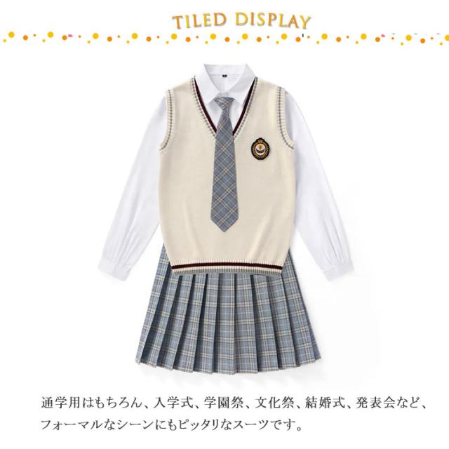 | 人気の女子用制服5点セット。 生地や裁縫にこだわっているので、何回でも洗濯ができてコスパ抜群。 ベスト+シャツ+スカート+リボン+バッジのお得な5点セット。 中学生・高校生の学生制服や行事ごと、なんちゃって制服にもおすすめです。 通学用はもちろん、入学式、学園祭、文化祭、結婚式、発表会など、フォーマルなシーンにもピッタリなスーツです。 | |