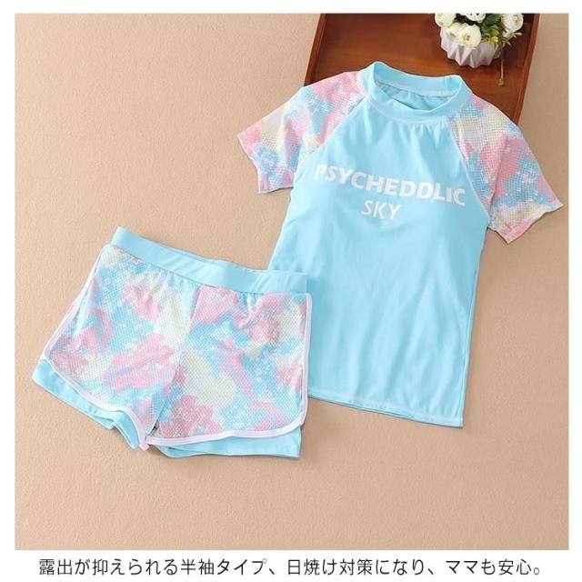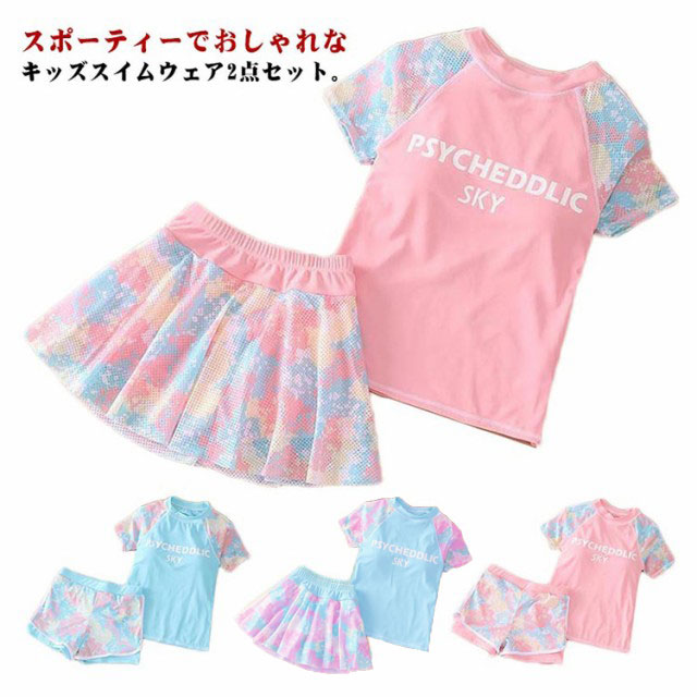 水着 2点セット 上下セット キッズ水着 ジュニア水着 フィットネス水着 ラッシュガード セパレート ショーツ 2点セット 半袖 ガールズ 100-150cm 小学生 スクール水着 水陸両用 スカート インナーパンツ付き 子供水着 ビーチ 海 プール
