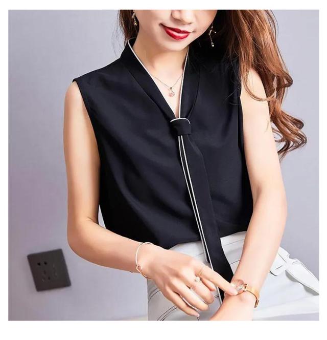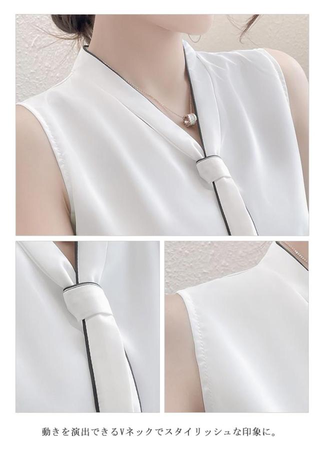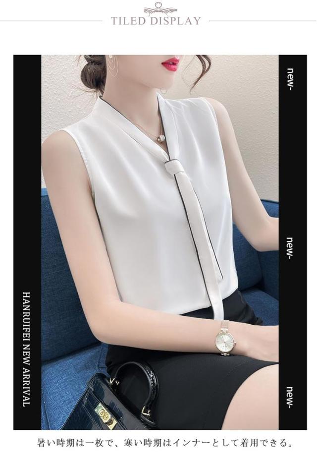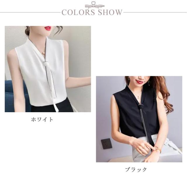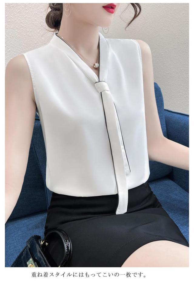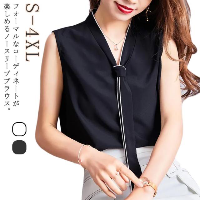Vネック ブラウス ノースリーブ レディース ボウタイ インナー トップス ノースリーブブラウス フォマール シンプル 無地 春夏 通勤 OL ブラック ホワイト S M L XL 2XL 3XL 4XL