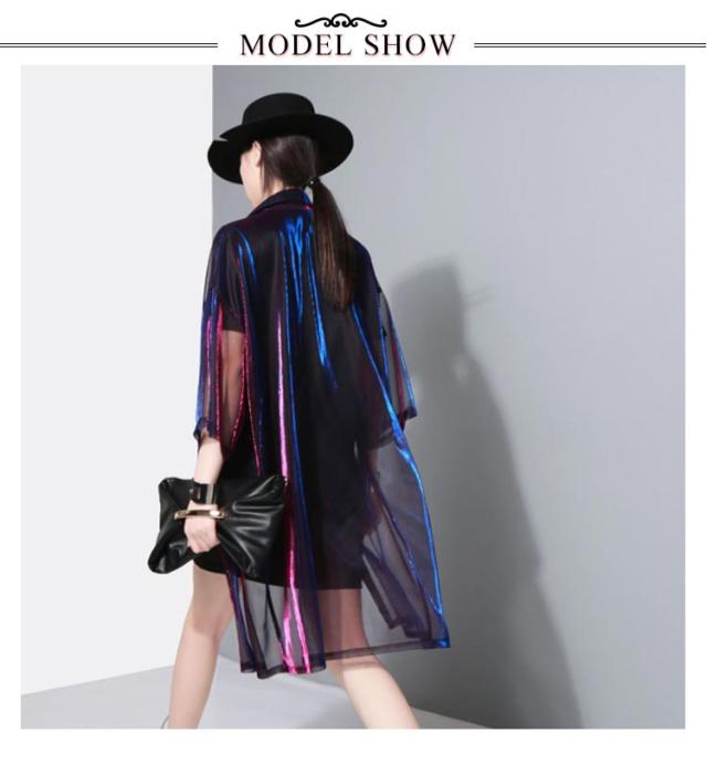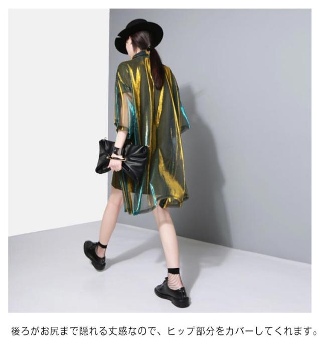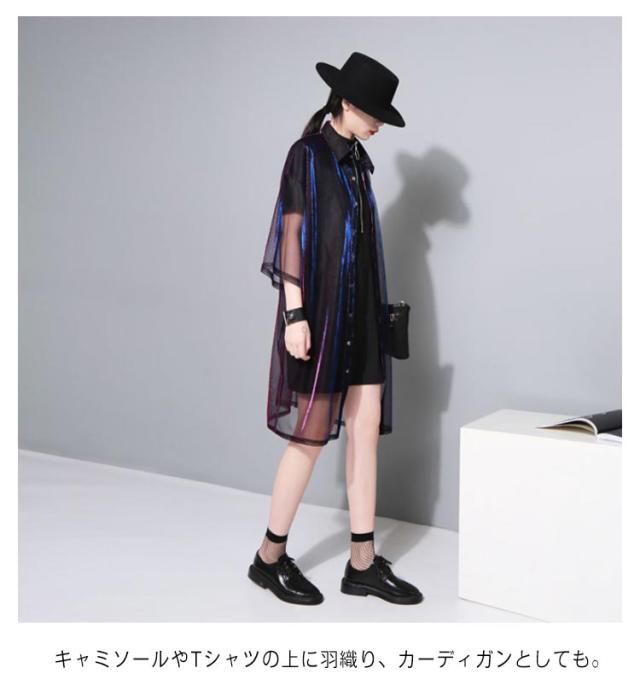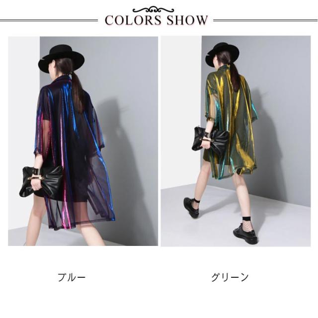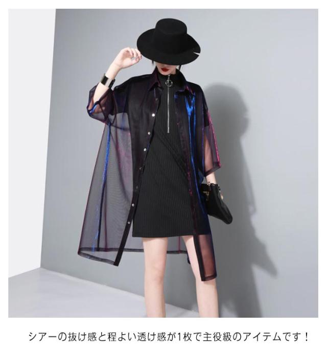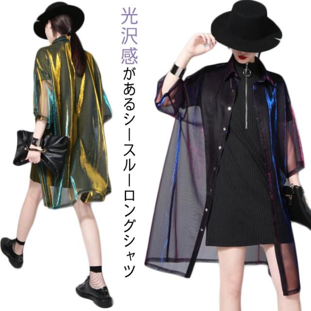 シースルー シャツ シアー トップス シアーシャツ ロング チュニック ブラウス 長袖 オーロラ 透け感 光沢 ダンス衣装 ジャズダンス ヒップホップ 薄手 重ね着 ストリート オーバーサイズ セクシー 七分袖 日焼け対策 冷房対策 羽織り 夏 韓国 ワイド レディース