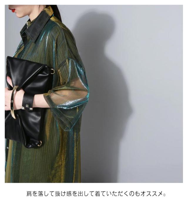 | 光沢感があるシースルーロングシャツ シアーの抜け感と程よい透け感が1枚で主役級のアイテムです! 後ろがお尻まで隠れる丈感なので、ヒップ部分をカバーしてくれます。 肩を落して抜け感を出して着ていただくのもオススメ。 キャミソールやTシャツの上に羽織り、カーディガンとしても。 | |