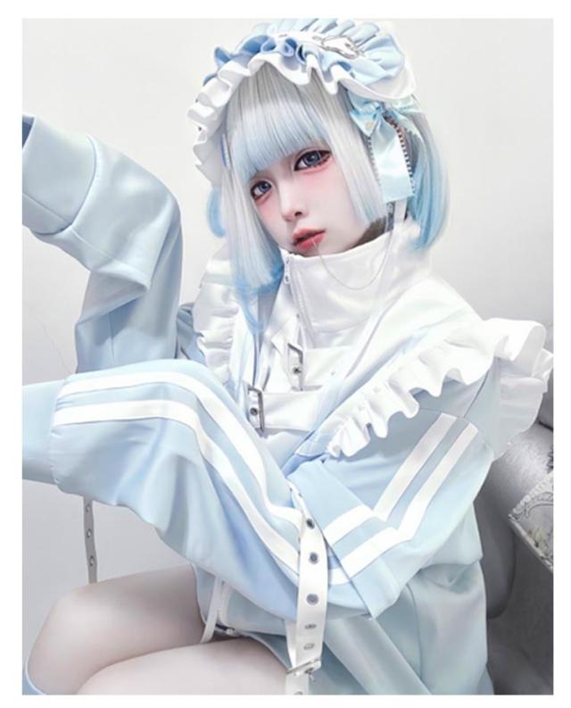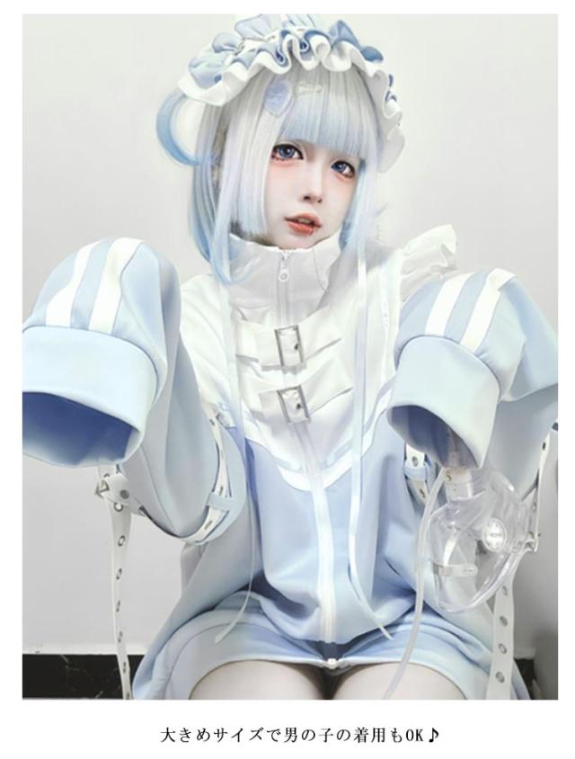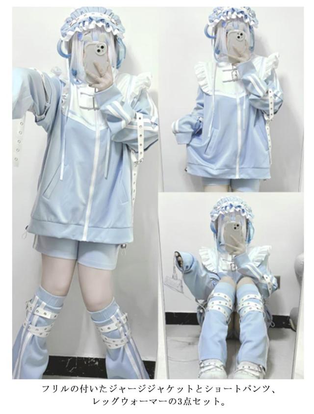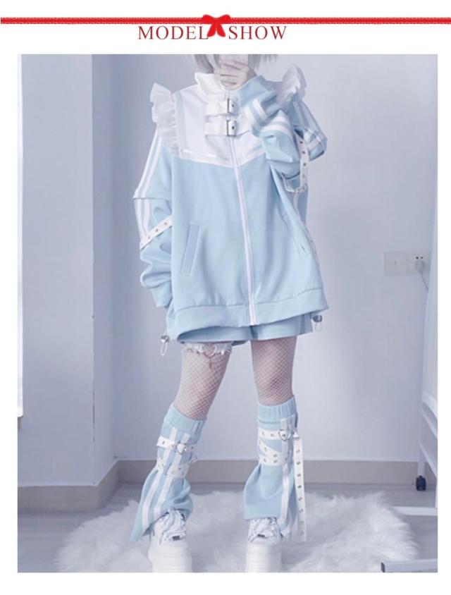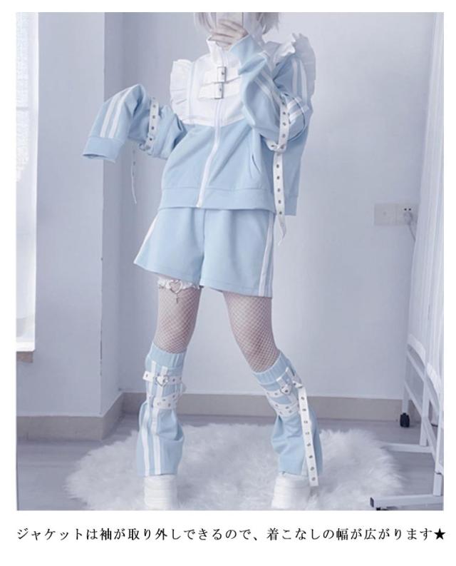 水色 地雷系 サブカル ジャージ 3点セット フリルジャケット ブルゾン ハーフパンツ レッグウォーマー 長袖 原宿系 ファッション 上下セット 地雷系 服 サブカル地雷 天使界隈 天使 水色界隈 レディース メンズ 送料無料