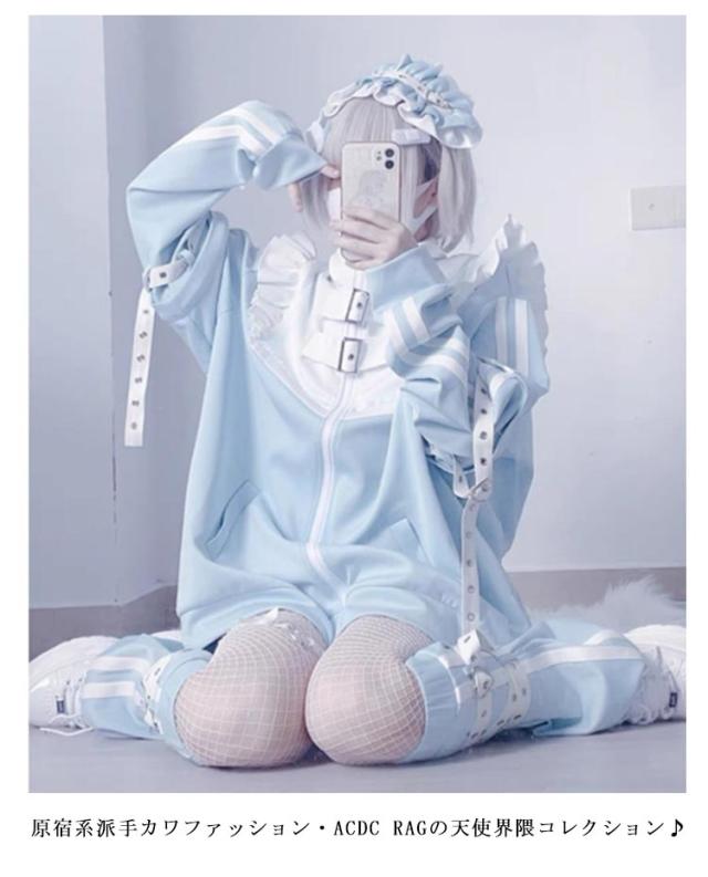 | 天使界隈をイメージした水色コレクションが誕生♪ 【3点セット】 フリルの付いたジャージジャケットとショートパンツ、レッグウォーマーの3点セット。 ジャケットは袖が取り外しできるので、着こなしの幅が広がります★ 大きめサイズで男の子の着用もOK♪ 原宿系派手カワファッション・ACDC RAGの天使界隈コレクション♪ | |