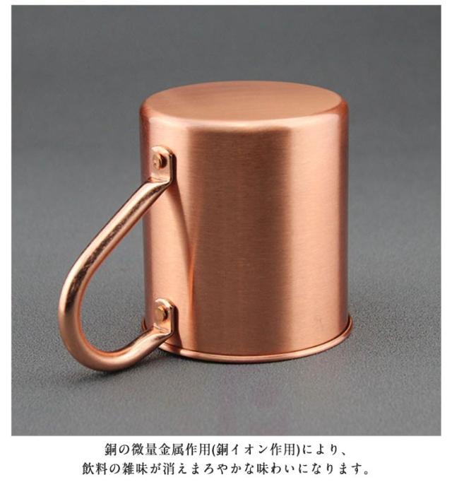 | 純銅製マグカップ。 冷たい飲み物を入れた瞬間からカップが冷え始め、短時間で全体が均一に冷たくなります。指先や唇から伝わるその清涼感は格別です。 保冷効果も持続しますので、時間が経っても冷たいまま美味しく味わえます。 銅の微量金属作用(銅イオン作用)により、飲料の雑味が消えまろやかな味わいになります。 銅イオンの働きが微生物の発生を防ぎ、衛生的です。 ビールだけじゃなく、アイスコーヒーや冷たいお茶にもおすすめです。 唇越しに伝わる冷たさが飲み物をよりおいしく感じさせます。 | |