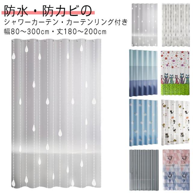 | 防水・防カビのシャワーカーテン・カーテンリング付き 幅80〜300cm・丈180〜200cm 水の飛び散りを防ぐのはもちろん、おしゃれな柄で浴室の雰囲気をアップデートして頂けます♪ カーテンリング付属しているので、カーテンポールに引っ掛けるだけで取付できます。(カーテンポールは付属しません。) 素敵な水滴柄や可愛い猫柄など全8色展開、部屋の間仕切りとしてもご利用頂けます。 ちょっとした目かくしや、暖房、冷房の効率アップにも。 | |