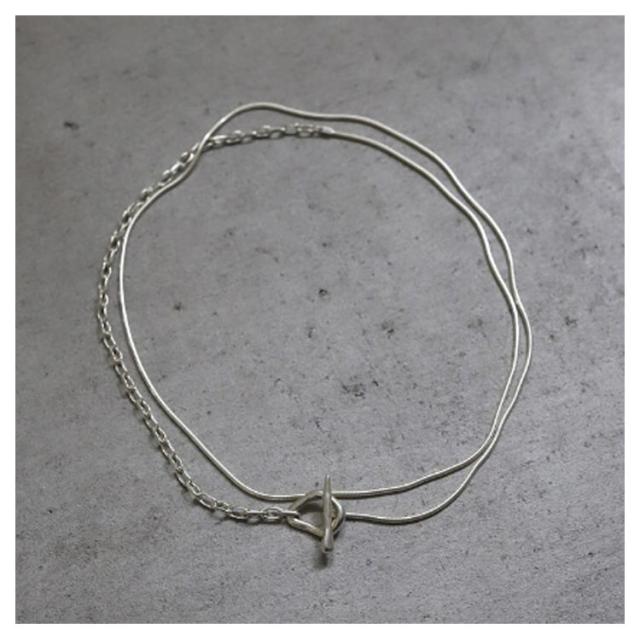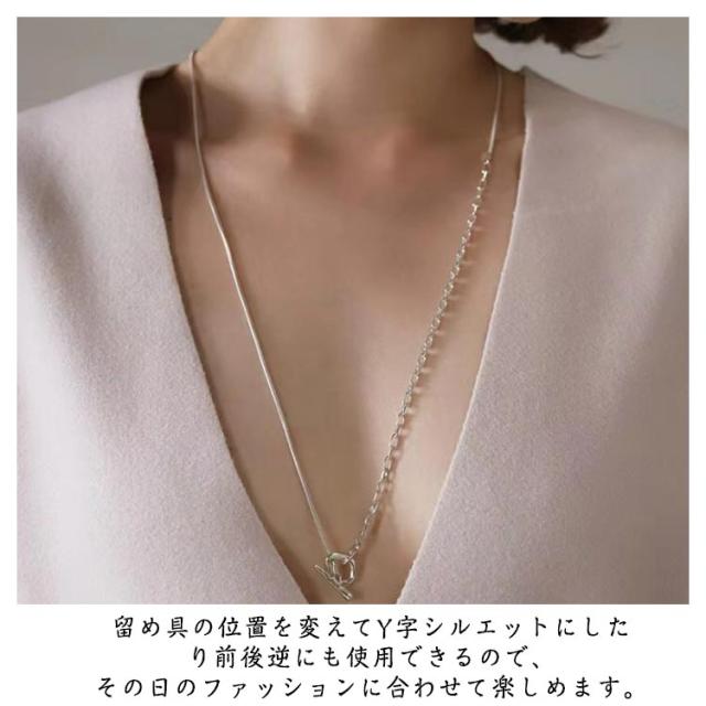 | 2種類のチェーンがドッキングされたスタイリッシュな印象のロングネックレス。 着け方によって違った印象に魅せてくれます。 留め具の位置を変えてY字シルエットにしたり前後逆にも使用できるので、その日のファッションに合わせて楽しめます。 飽きのこないおしゃれなデザインなので、彼女や家族、友人へのプレゼントなど、ギフトにもオススメなアクセサリーになります。 | |