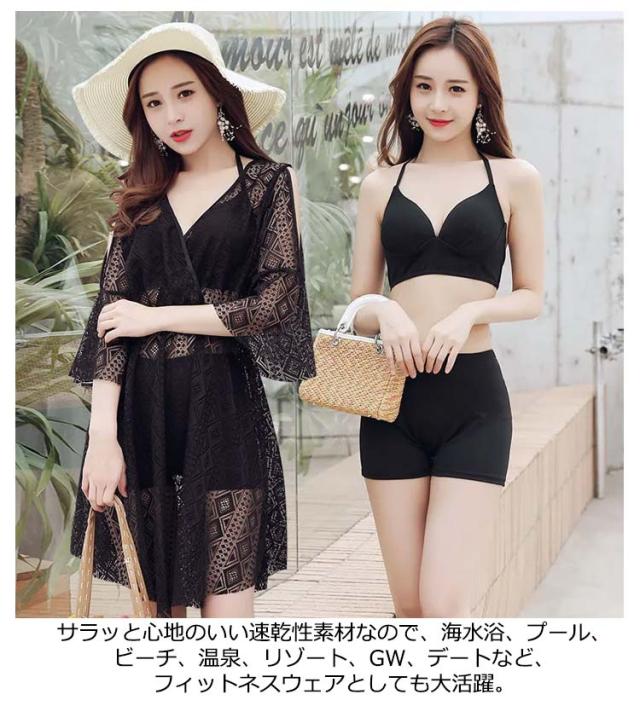 | 長いTシャツは可愛くて体型カバーもできる3点セット ほどよく日焼け対策できる半袖タイプで、肌の露出が苦手な方にもオススメ!お腹周りもさりげなくカバー クールで知的な印象大人な雰囲気を醸し出しながらも、可愛さを忘れずにフィットネス水着。 露出の少なさとシンプルさを追求して出来上がったアイテムです サラッと心地のいい速乾性素材なので、海水浴、プール、ビーチ、温泉、リゾート、GW、デートなど、フィットネスウェアとしても大活躍 | |