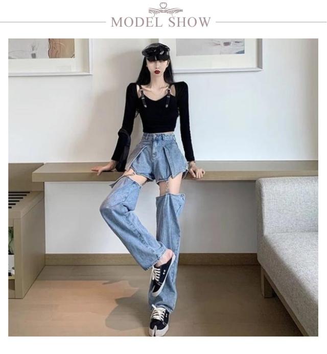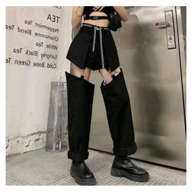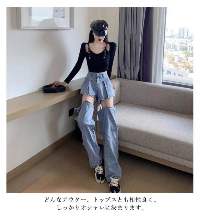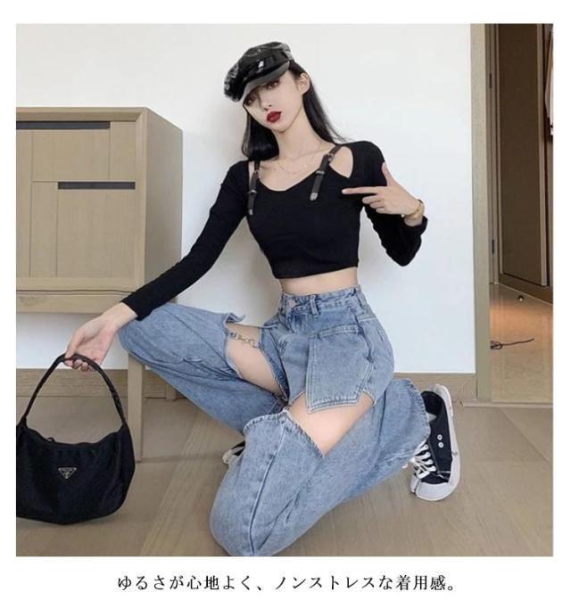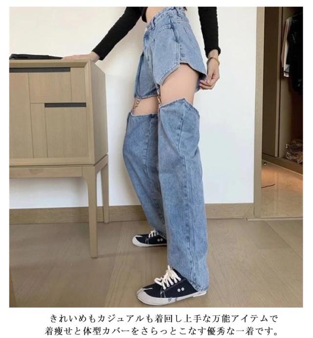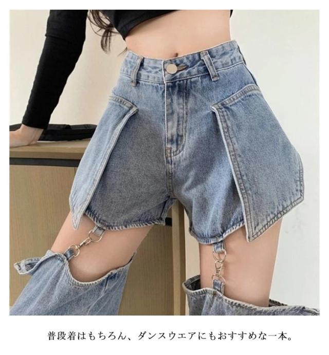 2WAY デニムパンツ 取り外し可 レディース ダンス ロングパンツ ショートパンツ ハーフパンツ ダンスパンツ 団体服 イベント 原宿系 ストリート おしゃれ かわいい レトロ ブラック ブルー S M L XL 2XL