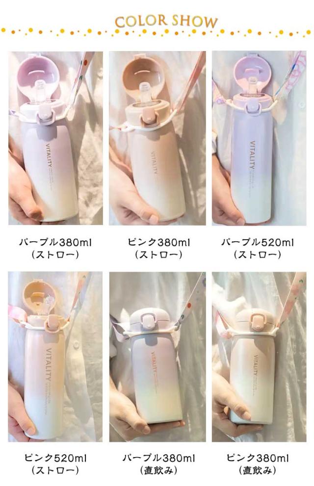 | 色 | パープル380ml(ストロー) ピンク380ml(ストロー) パープル520ml(ストロー) ピンク520ml(ストロー) パープル380ml(直飲み) ピンク380ml(直飲み) ブルー380ml(直飲み) パープル520ml(直飲み) ピンク520ml(直飲み) ブルー520ml(直飲み) |