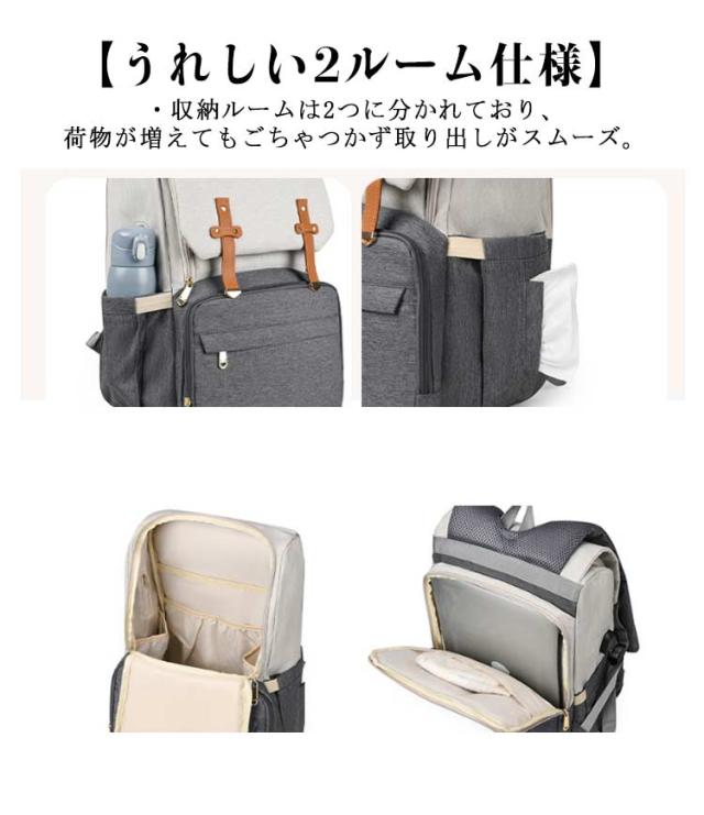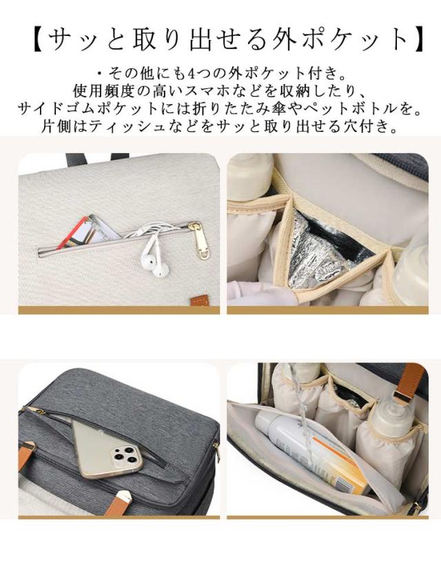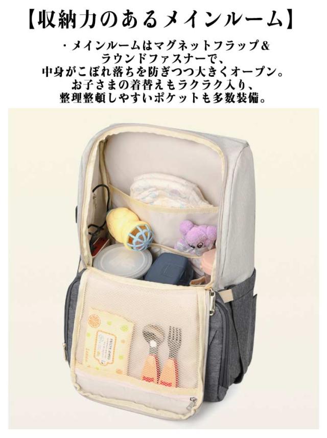 | ・色んなシーンで大活躍◎たっぷり入って機能的なマザーズバッグ新登場。 【安心のサイズと抜群の機能性】 ・程よいマチとたっぷりの深さで、お子さまとの外出に必要な荷物がひとまとめ。小物を整理しやすいポケットが充実、使い勝手にこだわった機能性の高さも魅力。 【うれしい2ルーム仕様】 ・収納ルームは2つに分かれており、荷物が増えてもごちゃつかず取り出しがスムーズ。 【収納力のあるメインルーム】 ・メインルームはマグネットフラップ&ラウンドファスナーで、中身がこぼれ落ちを防ぎつつ大きくオープン。お子さまの着替えもラクラク入り、整理整頓しやすいポケットも多数装備。 【ミニノートPCやタブレットが入るサブルーム】 ・背面のサブルームは、左右どちらからも開くダブルファスナー式。クッション材で電子機器を保護してくれるから、持ち運びも安心。(※メインルームのクッションポケットにもノートPCなどを収納可能。) 【哺乳瓶などを収納できるポケット】 ・前面の大きなポケットにはファスナーポケットとボトルポケットを搭載。ボトルポケットの内側はアルミ蒸着仕様で、熱が逃げにくくミルクなどを保温にも! 【サッと取り出せる外ポケット】 ・その他にも4つの外ポケット付き。使用頻度の高いスマホなどを収納したり、サイドゴムポケットには折りたたみ傘やペットボトルを。片側はティッシュなどをサッと取り出せる穴付き。 | |
