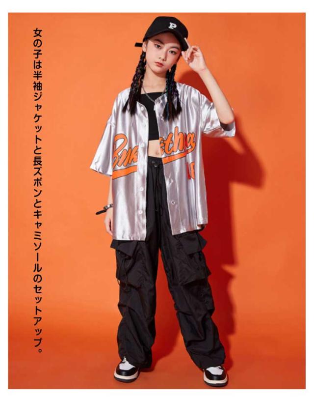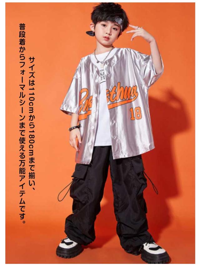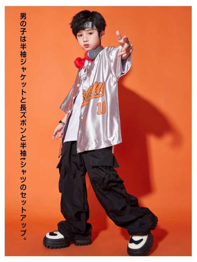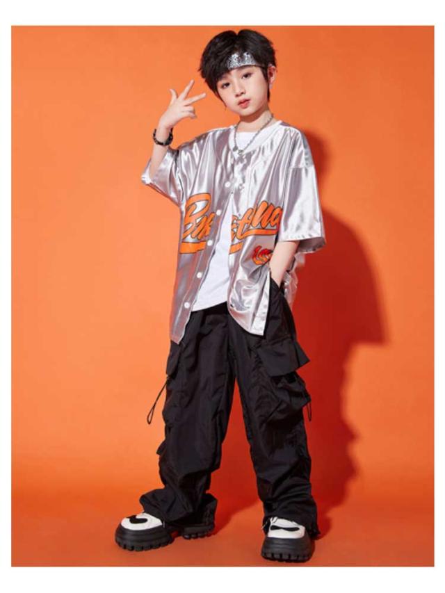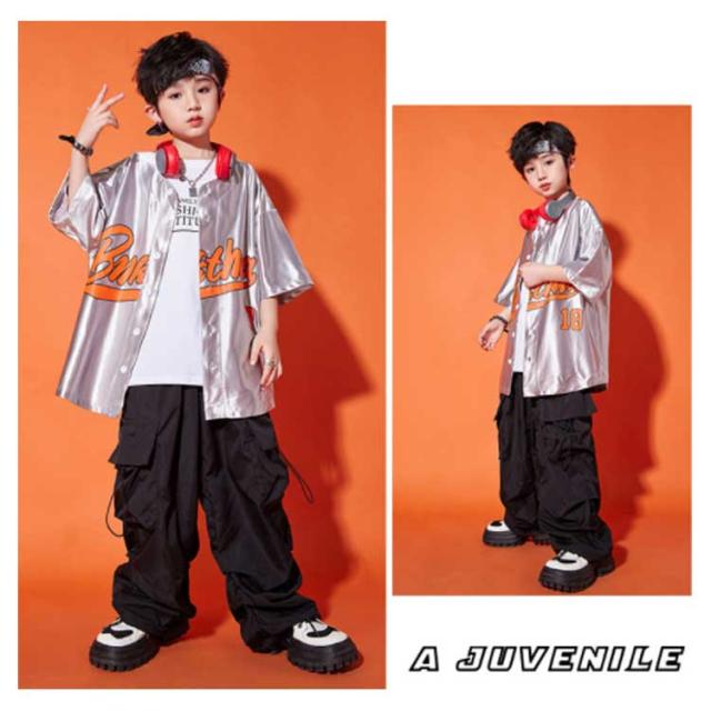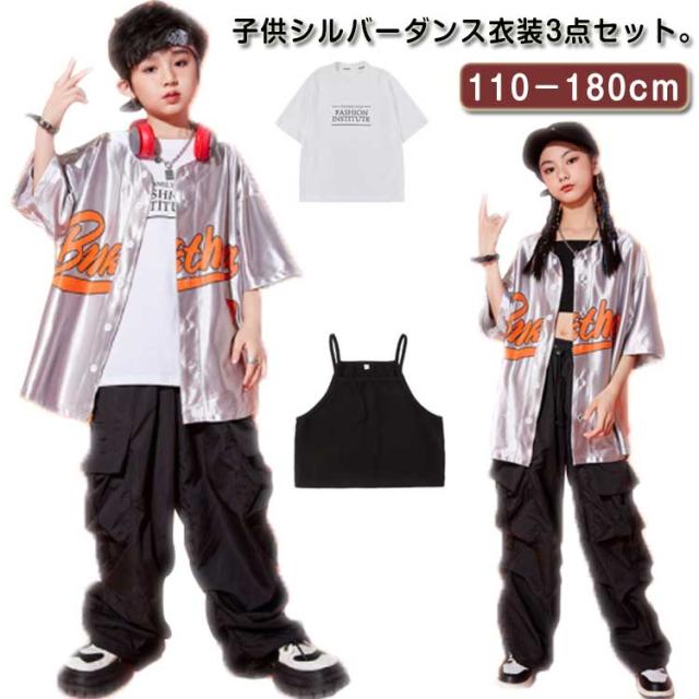 ダンス衣装 キッズ シャツジャケット カーゴパンツ ワイドパンツ ロング丈 セットアップ 夏用 カジュアルスーツ 3点セット 男の子 女の子 演出服 シルバー 舞台服 練習着 ストリート系 ジャズダンス かっこいい 普段着 子供服 110−180cm 送料無料