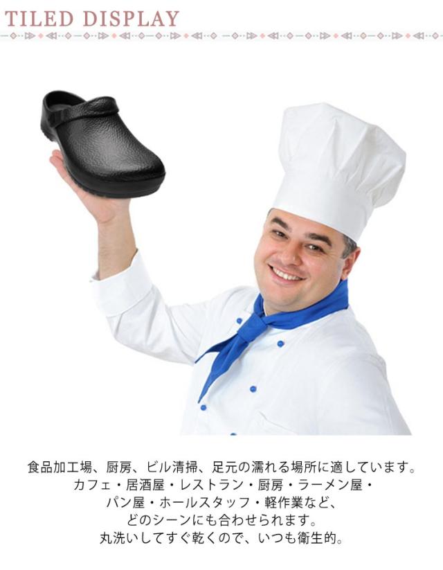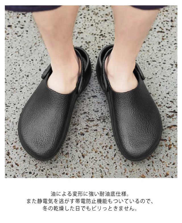 | 軽量、だけど防水性のあるEVA素材で作られたコックシューズ。 靴の甲部分には、耐油性・耐久性に優れたEVA素材を採用!油や汚れがついてもサッと拭き取れて、防水・防油で常にキレイに保てるコックシューズ。 厚みのあるアッパーが、調理器具の落下などから足を守ります。 足先が窮屈に感じないゆったりしたデザインを採用。 油による変形に強い耐油底仕様。また静電気を逃がす帯電防止機能もついているので、冬の乾燥した日でもビリっときません。 食品加工場、厨房、ビル清掃、足元の濡れる場所に適しています。カフェ・居酒屋・レストラン・厨房・ラーメン屋・パン屋・ホールスタッフ・軽作業など、どのシーンにも合わせられます。丸洗いしてすぐ乾くので、いつも衛生的。 | |