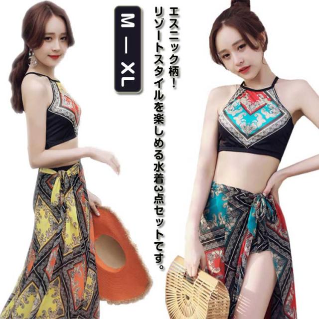 ビキニ 水着 レディース 体型カバー カップ付き エスニック柄 スカート 3点セット 体型カバー セパレート オトナ女子 水着セット ショートパンツ ビーチ 海 温泉 20代 30代 40代 露出控えめ リゾート M L XL