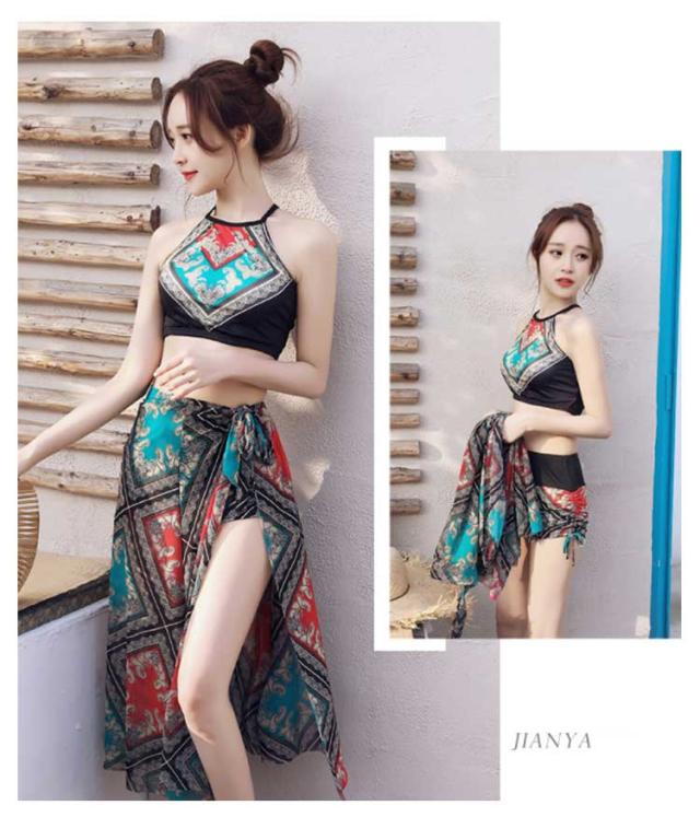 | エスニック柄!リゾートスタイルを楽しめる水着3点セットです。 嬉しいパッド付き、しっかりバストをホールドすることで安心感もあります。 ショーツはショートパンツタイプでカジュアルに表現。 コーデを楽しみたい時や体型カバーしたい時はスカートをON! 大胆なスリットがセクシー! | |