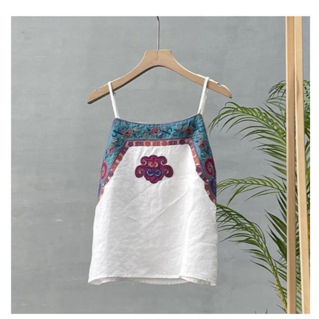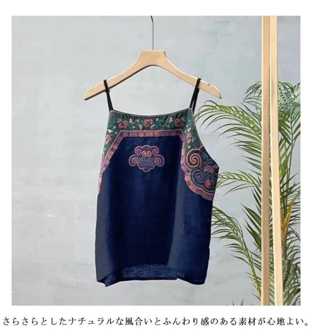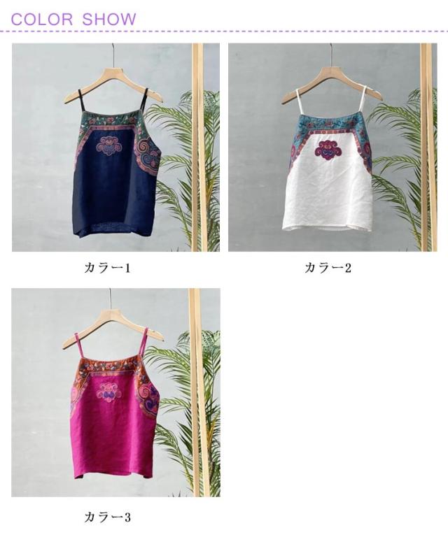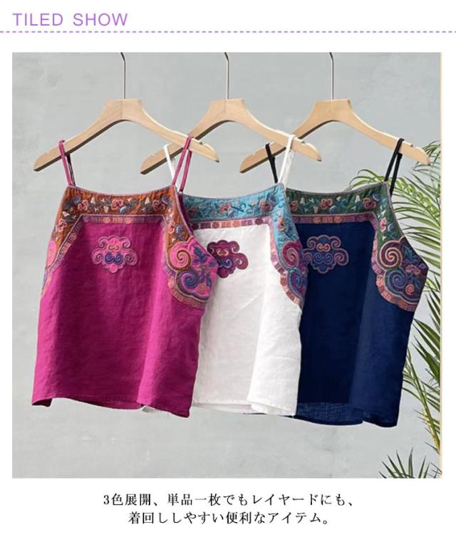 エスニック キャミソール 刺? レディース ノースリーブ 重ね着 トップス レイヤード 着?せ 夏 チャイナ風 綿麻 ナチュラル M L XL 2XL 3XL