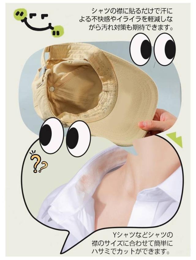 | 【襟汚れ防止パッド・帽子汗取りパッド】【貼るだけ】【100枚入り】 お得な100枚セット!シャツの襟や帽子に装着する、汗取りパッドです。 シャツの襟に貼るだけで汗による不快感やイライラを軽減しながら汚れ対策も期待できます。 表面は綿素材なので肌に優しく、老若男女問わずご使用いただけます。 使い捨てタイプなのでいつでも清潔にご使用いただけます。 yシャツなどシャツの襟のサイズに合わせて簡単にハサミでカットができます。 シールを剥がして貼り付けてご使用ください。 | |
