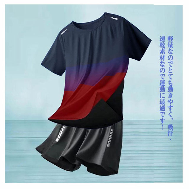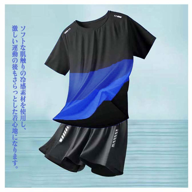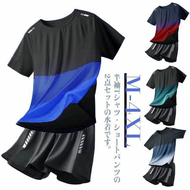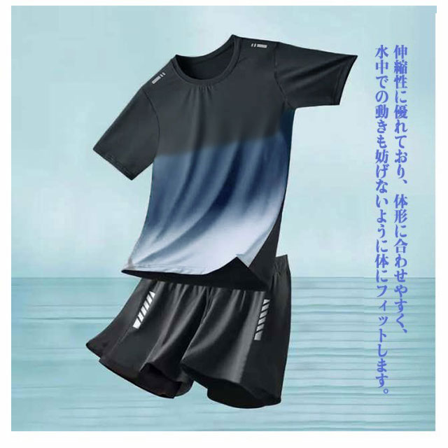 水着 メンズ 上下セット 半袖Tシャツ ハーフパンツ ラッシュガード 大きいサイズ インナーパンツ付き 男性用 海パン スポーツ ジム 海 ブルー 大きいサイズ ストレッチ性 吸汗速乾 通気性 水陸両用 カジュアル 送料無料