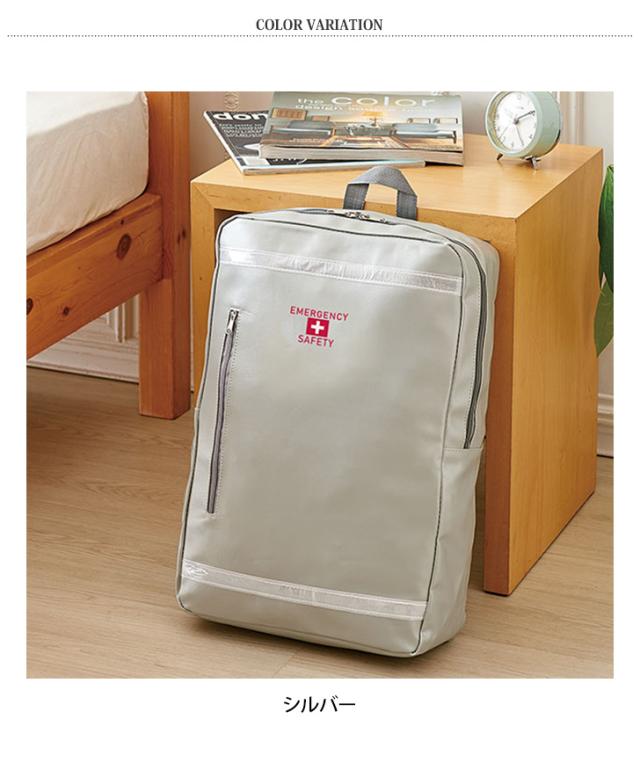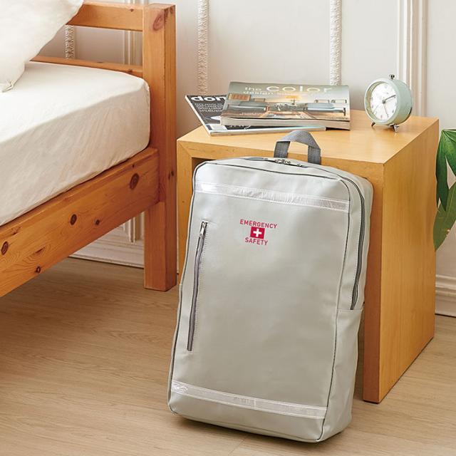 スマートなデザインと防災イメージを両立させたリュックバッグタイプの避難セット