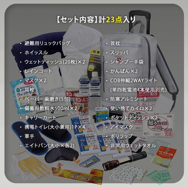 避難用リュックバッグ、ホイッスル、ウェットティッシュ(20枚)×2、レインコート、マスク×2、耳栓、ペーパー歯磨き(5包)、備蓄用飲料水500ml×2、キャリーカート、携帯トイレ(大小兼用)1P×4、軍手、エイトバン(大小×各2)、首枕、スリッパ、シャンプー手袋、かんぱん×2、COB伸縮2WAYライト(単四乾電池4本使用別売)、防寒アルミシート、使い捨てカイロ×2、ポケットティッシュ×2、アイマスク、ポリラップ、非常用ウェットタオル
