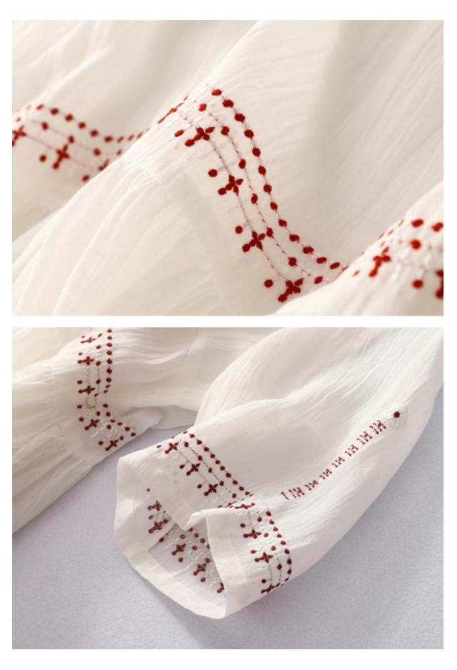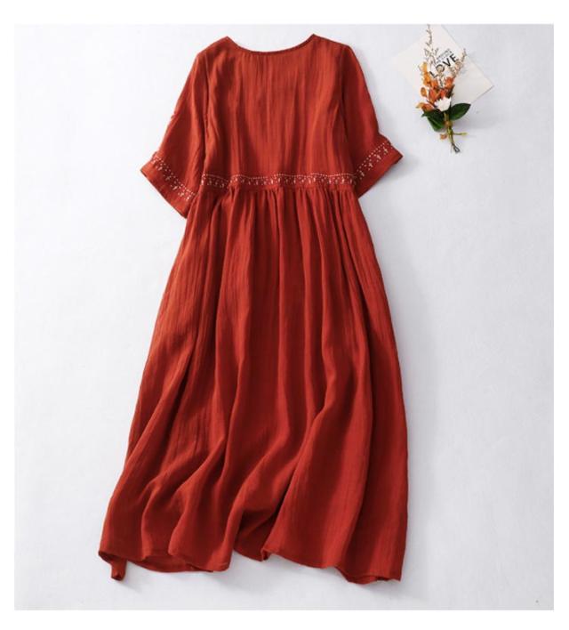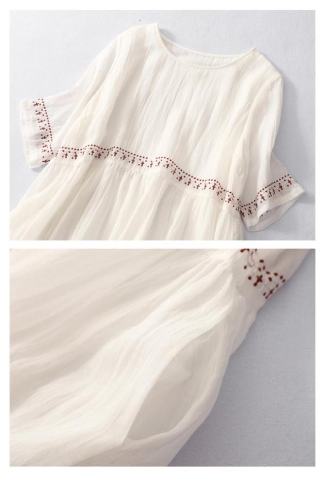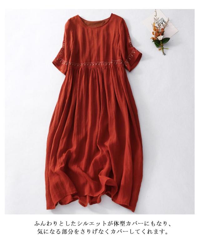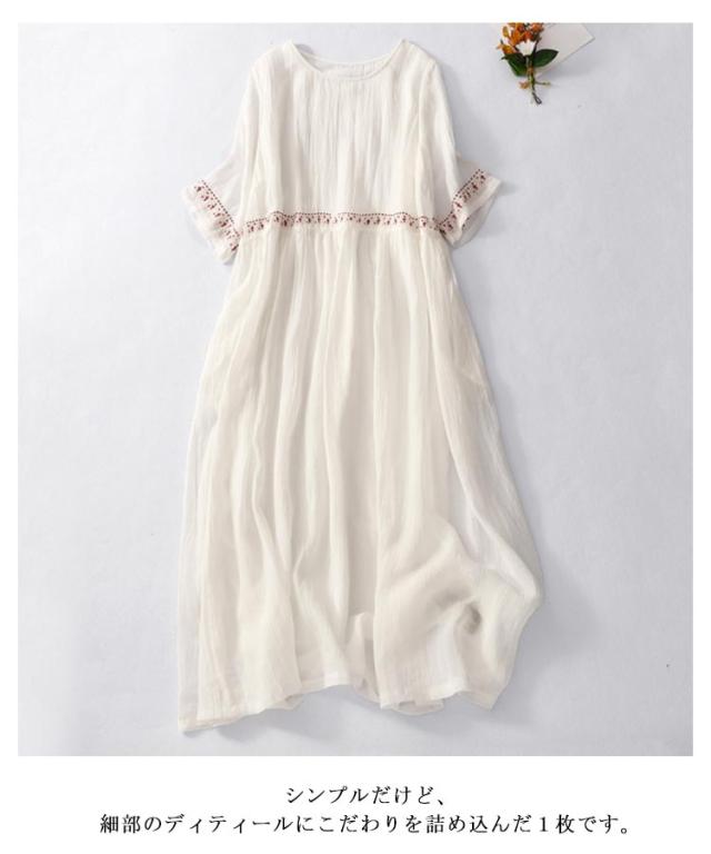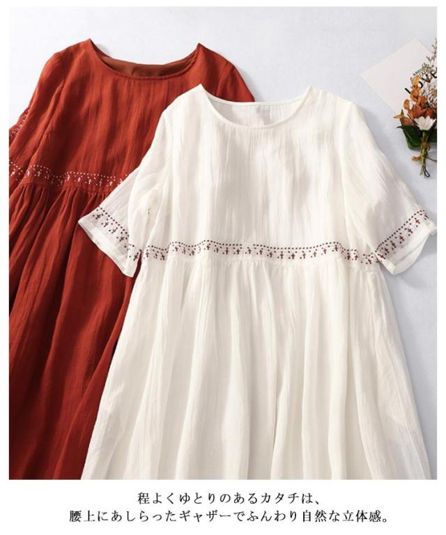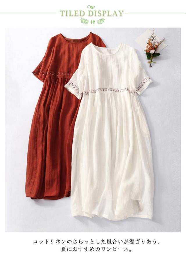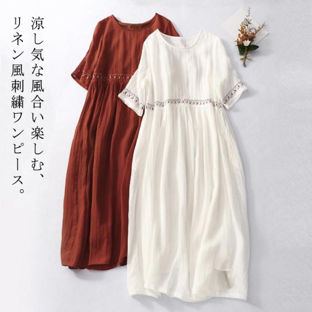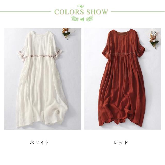 リネン風ワンピース ラウンドネック 刺繍 半袖 ワンピース アジアン リゾートワンピース ロングワンピース 膝下 綿麻風 着痩せ 森ガール 夏ワンピース 花柄 おしゃれ 大きいサイズ 旅行 カジュアル 春 夏 ホワイト レッド
