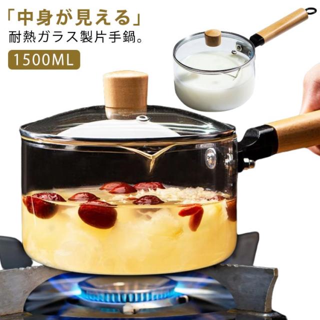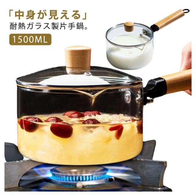 | 「中身が見える」耐熱ガラス製片手鍋。【1500ml】 スープやソース、ヌードル作りはもちろん、ジャムやアップルパイなどスイーツ調理にもおすすめです。 専用蓋がついているので、蒸し料理やポトフなどの煮込み料理にもお使いいただけます。 V字型注ぎ口で、液体を注ぐときにとっても便利です。 加熱中の食材の具合や保存されている食材が一目瞭然。 直火、ガス火の使用が可能です。 | |