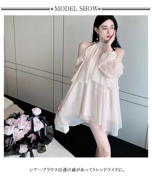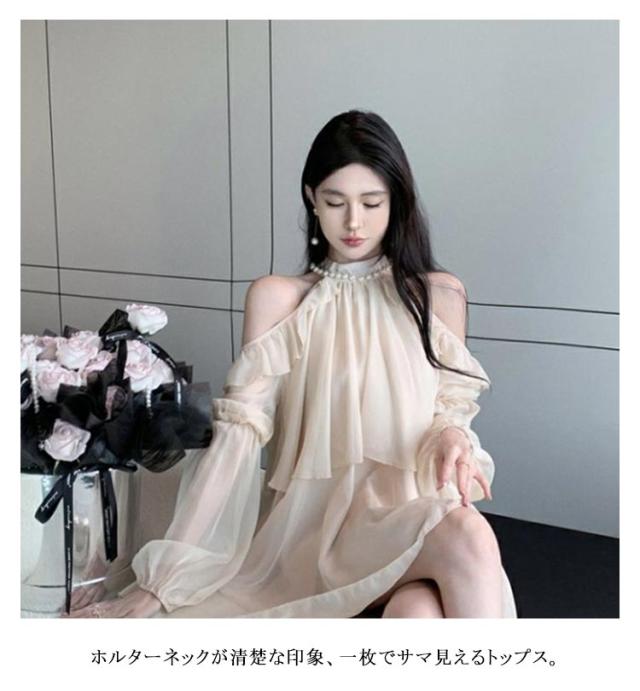 肩出し トップス オープンショルダー 裾フレア ペプラム ブラウス ホルターネック レディース 春 夏 秋 オフショルダー 長袖 シャツブラウス おしゃれ きれいめ 上品 かわいい ボリューム袖 パフスリーブ カジュアル 大きいサイズ 体型カバー フリル シアー 肌見せ