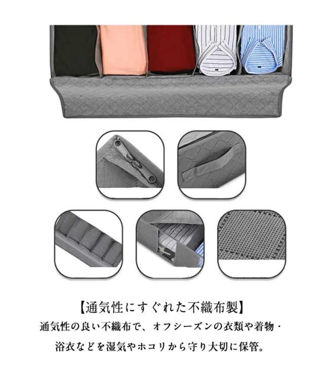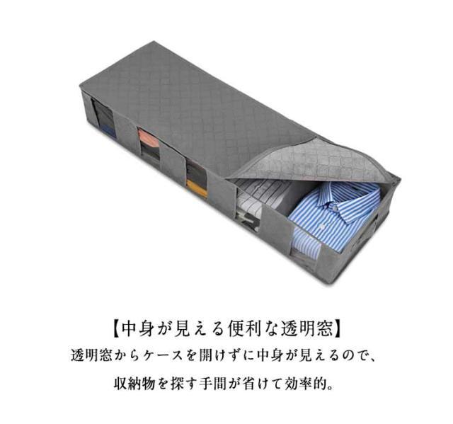 | ベッドの下の収納箱を使ってあなたの家をすぐにきれいに再現しましょう! ベッドの下やクローゼットの中のスペースを活用して、季節物の衣類、寝具、紙おむつ、ベビーウェット、靴などを収納することができます。 【スペースを有効活用】 ベッド下のスペース、クローゼットの空きスペース、押入れの隙間などにピッタリな収納ケース。 【通気性にすぐれた不織布製】 通気性の良い不織布で、オフシーズンの衣類や着物・浴衣などを湿気やホコリから守り大切に保管。 【中身が見える便利な透明窓】 透明窓からケースを開けずに中身が見えるので、収納物を探す手間が省けて効率的。 【取っ手付きで出し入れが楽】 両サイドに取っ手(引き手)がついているので、ベッド下や押入れからの出し入れもラクラク。 【中に仕切り付き】 持ち運び時に衣類がたたみ崩れてしまうのを防ぎます。収納する時にも仕切りがあると素早く中に衣類を収納できます。 | |