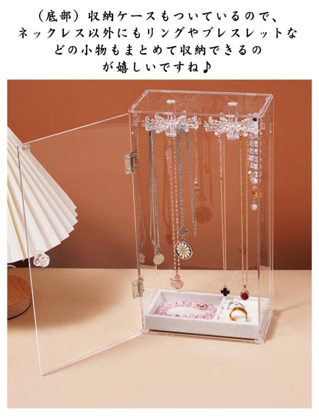 | ネックレスが絡まずに収納出来るだけじゃないっ!お気に入りのジュエリーを、飾って、見せて、便利に収納! 扉式なのでネックレスの出し入れも楽々!扉の取っ手を軽く押し上げると扉が開きます。 フックは回転するので、奥に吊るしたものも取り出しやすくなってます! (底部)収納ケースもついているので、ネックレス以外にもリングやブレスレットなどの小物もまとめて収納できるのが嬉しいですね♪ 素材は無色・高透明度のアクリル製なので、アクセサリーを見せながら収納できインテリアとして最適です。 透明度が高く、シンプルなデザインなのでネックレスを入れて飾っておくだけで お部屋のインテリアにも! 24本のフック付き!最大72本ネックレスがかけられます。 | |