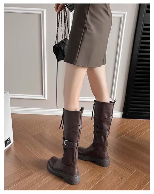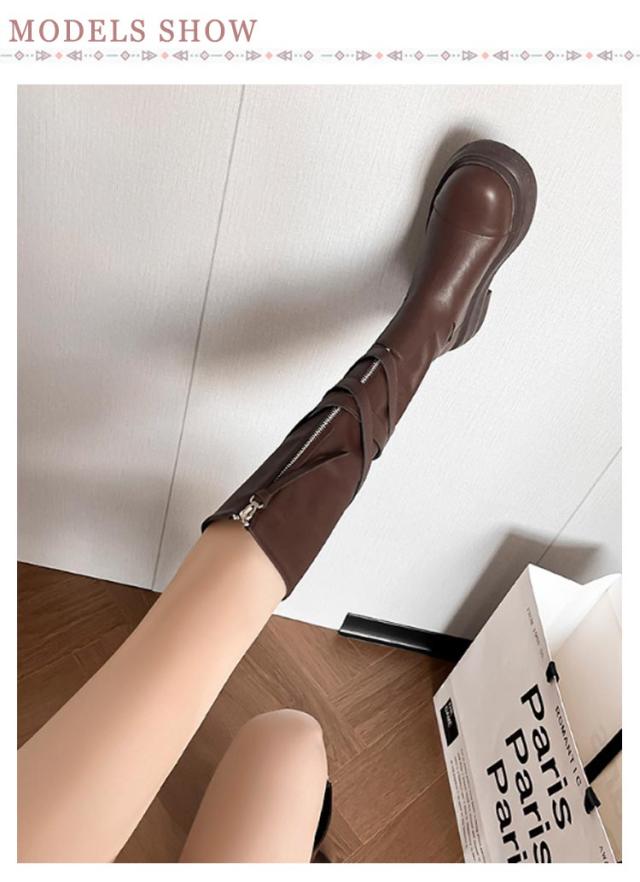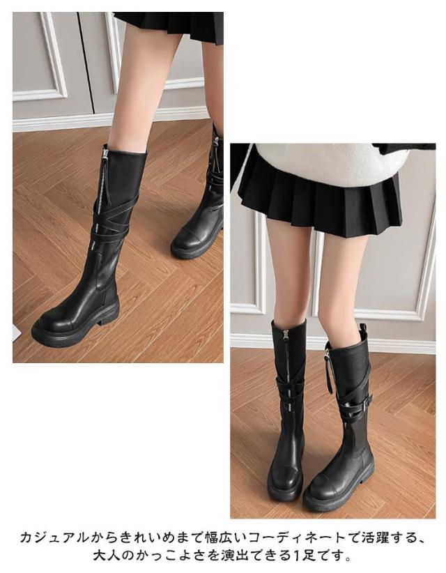 フロントジップブーツ 折り返し ブーツ レディース ロングブーツ レディース 2way ベルト 5cmヒール ラウンドトゥ センタージップ 合皮 靴 痛くない 歩きやすい 履きやすい ジッパー カジュアル ボリュームソール