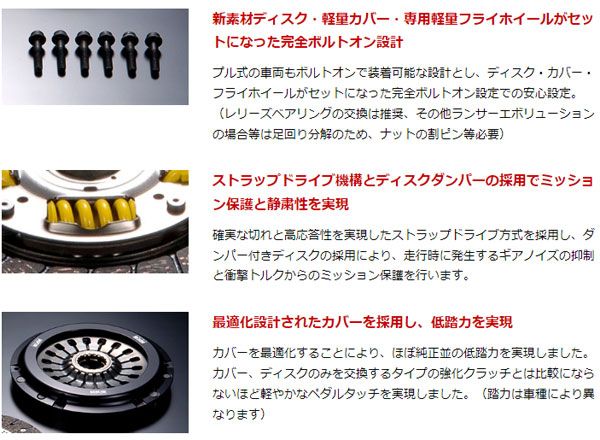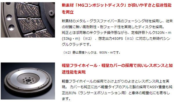 ジャダーの発生を徹底的に抑えた新開発の「MGコンポジットディスク」を採用し、純正に勝るとも劣らない、発進操作性と、メタル系を超える伝達トルク容量を実現し、ノーマル然とした扱い易さと高出力対応を両立。