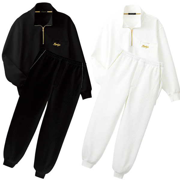 存在感の強いジャカード素材のハイZIPスーツ。左胸ポケット部分にゴージャスな金色刺繍のロゴ入り。カラーはホワイトとブラックの2色展開です。