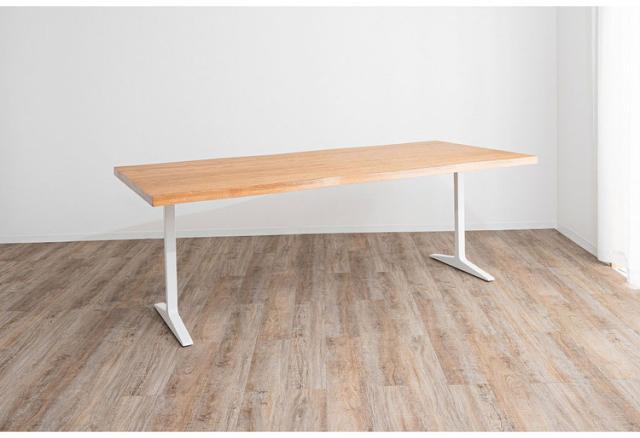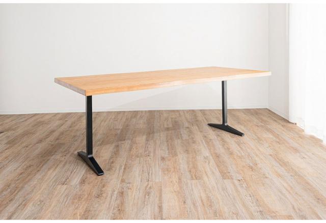 オーク無垢を使用した重厚感のある40mm厚天板。シンプルながらもデザイン性・耐久性のあるスチール製脚。木口も耳付き加工を施し、木本来の自然な風合いと温かみのある空間を演出できるダイニングテーブル。