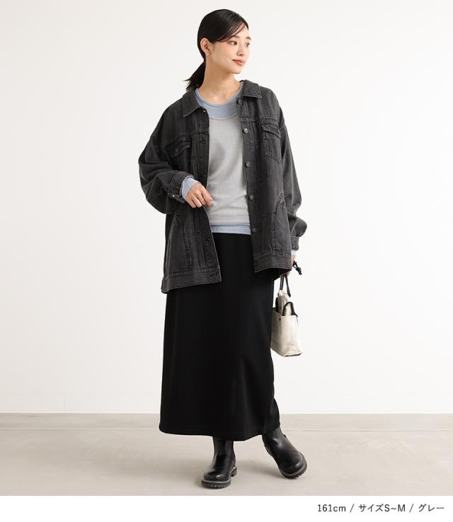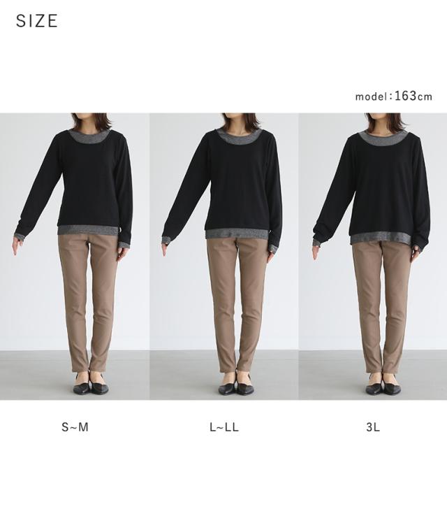 | staff:D/158cm B104 W90 H105 【普段着用】 Tops: L/LL Bottoms: L/LL | 【S〜M】 袖丈:手の甲が隠れる位 着丈:ヒップ真ん中位 腕周り:ジャスト バスト:少しタイト 全体:タイト 着用はでき、窮屈感はなかったですが、下着のシルエットをやや拾うので、インナー合わせで着用したいです。 【L〜LL】 袖丈:指先が少し見える位 着丈:ヒップ真ん中より下位 腕周り:ややゆったり バスト:ジャスト 全体:スッキリ 1枚でも着用できるサイズ感でした。スッキリと大人っぽく着用できました。しかし、タイトなシルエットが苦手な方は3Lが良いかもしれません。 【3L】 袖丈:指先まで隠れる位 着丈:ヒップ下少し見える位 腕周り:ゆったり バスト:ゆったり 全体:ゆったり 全体的にゆるっとしたシルエットで着用できました。身ごろがゆったり感がありますが、裾を少しあげても腰あたりで止まるので、あえてゆるっとしたシルエットで着用するのも大人の抜け感が出て可愛かったです。 私の場合は、L〜LLを選びます。 |