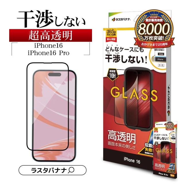 iPhone16 16 Pro iPhone15 ガラスフィルム 平面保護 高光沢 高透明 クリア 干渉しない 0.33mm 硬度10H ガイド枠付き ラスタバナナ