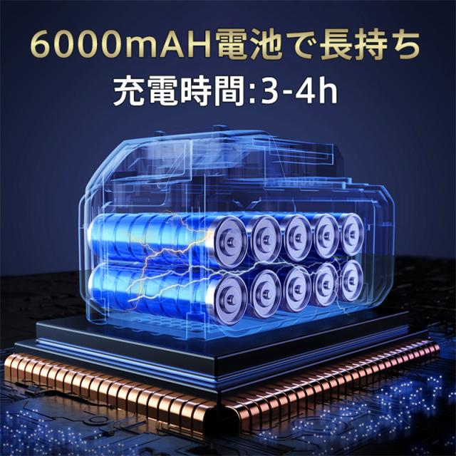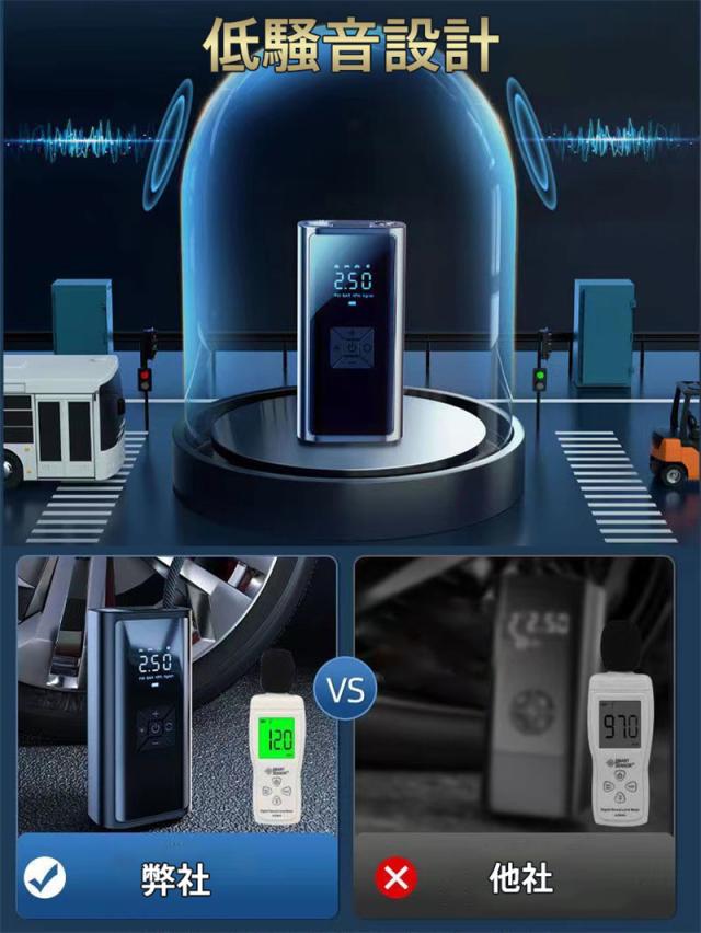大容量バッテリーを搭載しており、満充電の場合は約6つの自動車空気タイヤ、約15つの空き自転車タイヤ、約20つの空きボールに空気充填できます