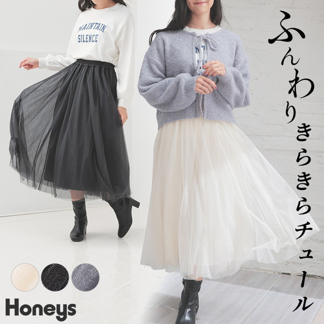 ボトムス スカート ロングスカート ロング丈 フレアスカート チュール 裏地付き 光沢感 レディース SALE セール Honeys ハニーズ チュールスカート