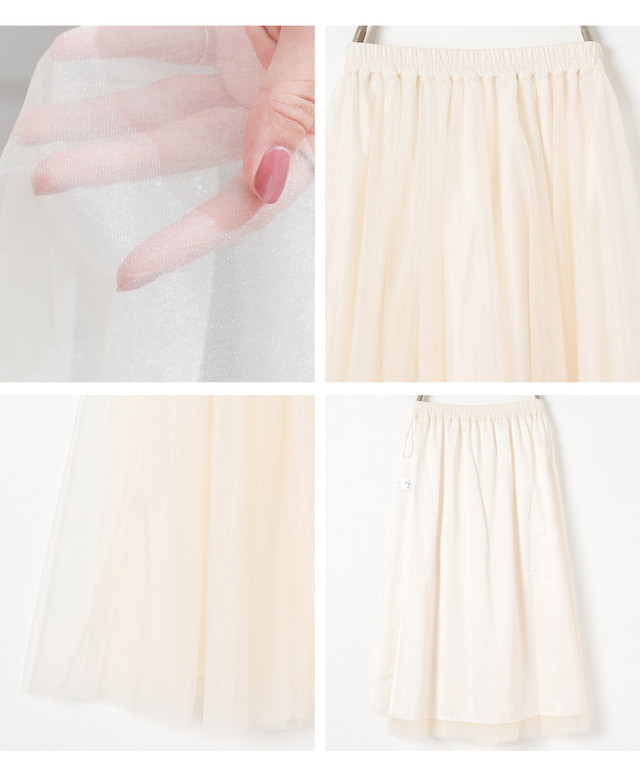 2枚重ねたキラキラのチュールが、動くたびにふわっと揺れる女性らしいデザイン。