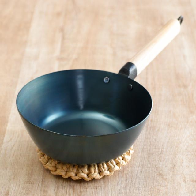 ハードテンパー加工が施された鉄フライパンです。本体には赤サビが発生しにくい黒皮鉄を使い、さらに仕上げで700度近くなるまで焼き入れ加工を施しています。この加工により、使い始めでも油がなじみやすくなり、使い始めの「空焼き・油ならし」が不要になりました。