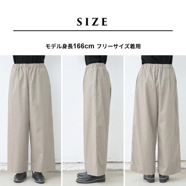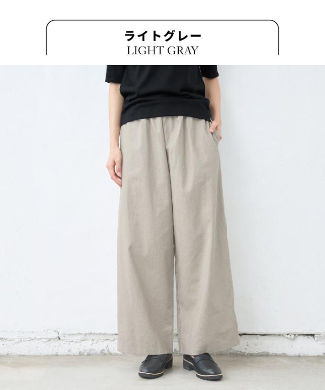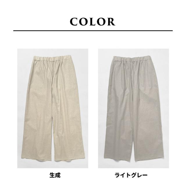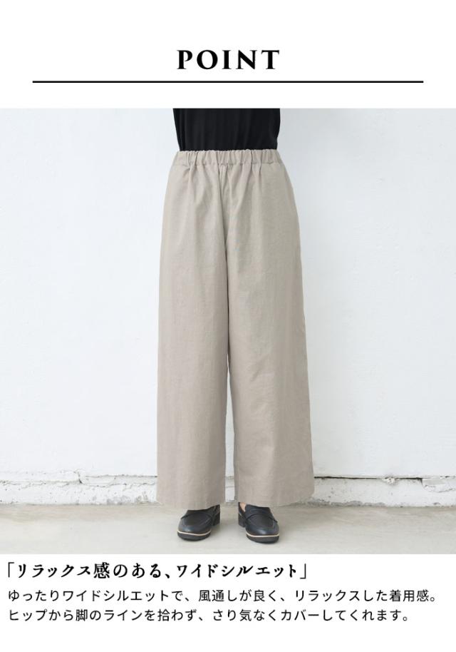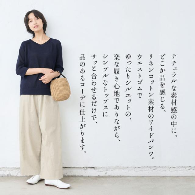 特徴 ナチュラルな素材感の中に、どこか品を感じる、リネンコットン素材のワイドパンツ。ウエストゴムでゆったりシルエットの、楽な履き心地でありながら、シンプルなトップスにサッと合わせるだけで、品のあるコーデに仕上がります。